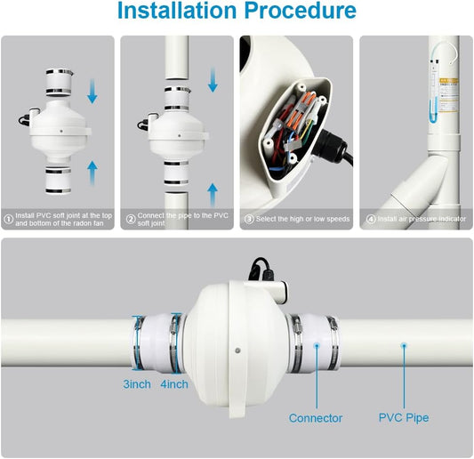 4 to 3 inch Radon Mitigation System Kit - 2 Speed Radon Fan 240CFM | 168CFM with Rubber Couplings and Air Pressure Indicator, Quiet and Energy Efficient, Fits 3” Piping