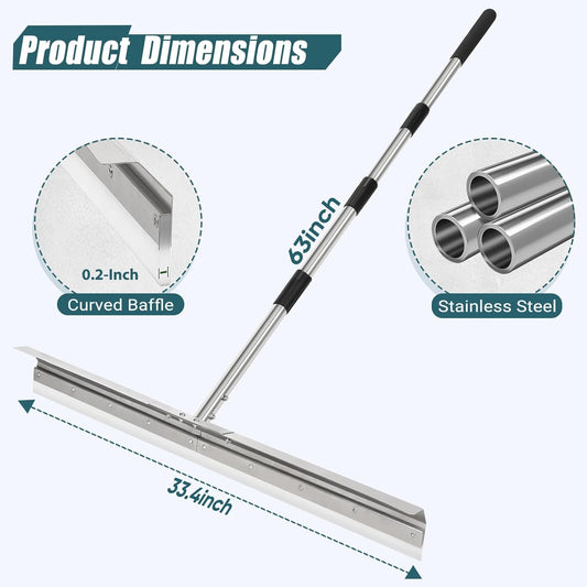Heavy-Duty 33.4" Floor Squeegee for Concrete, Industrial Silicone Blade Squeegee for Floor with 63" Stainless Handle, Anti-Splash Curved Baffle Design for Garage, Factory, Warehouse