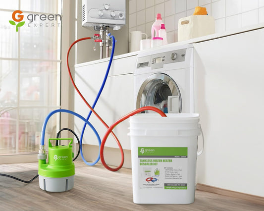 Tankless Water Heater Flushing Kit, 6-in-1 Descaling Kit with 1/3HP Utility Pump, 3-Gallon Bucket w/Lid Opener, 2×6ft 3/4" GHT Red&Blue PVC Hoses, Wrench & Adapter, for Isolation Valves