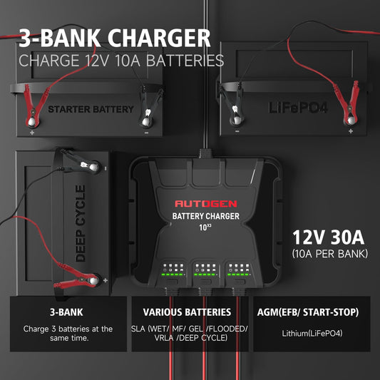 3-Bank Smart Marine Battery Charger, 12V 30A (10A/Bank) Waterproof Onboard Boat Charger, Battery Maintainer and Desulfator for Deep-Cylce, AGM and Lithium(LiFePO4) Batteries