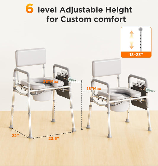 Bedside Commode with Padded Seat & Backrest, Aluminum Toilet with 6.5 qt Bucket, Easy-Clean, 350 lb Capacity Enhanced Crossbar, Portable Toilet for Seniors with Paper Holder & Newspaper Bag