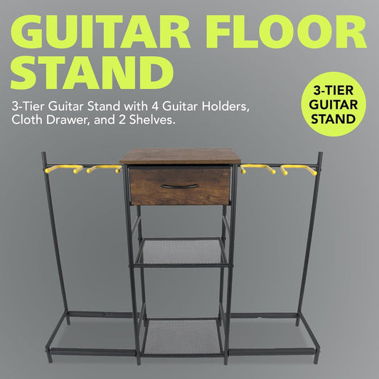 3-Tier Multi Guitar Floor Stand with Amp Stand and Cloth Drawer, Space-Saving Floor Guitar Rack for 4 Acoustic, Electric, or Bass Guitars and Ukeleles