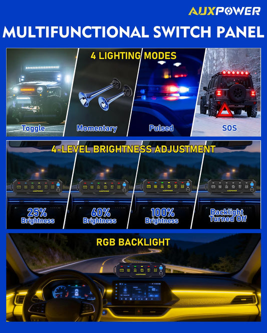 Auxpower 6 Gang Wireless Switch Panel S6W Control Range Up to 328FT Toggle Momentary Pulsed SOS RGB Switch Panel Auxiliary Portable Remote Panel Automotive Slim Switch Panel for Pickup Truck Boat UTV RGB S6W