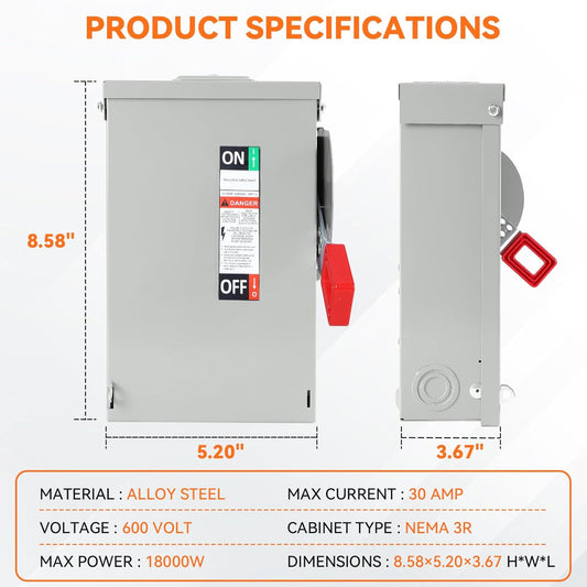 30 Amp Disconnect Switch, Fusible, 3 Pole 600 Volt, with Interlock Mechanism, Anti Corrosion and Rust Prevention, NEMA 3R Enclosure for Indoor&Outdoor, 10-Year Warrnaty, 30 Amp Disconnect Box