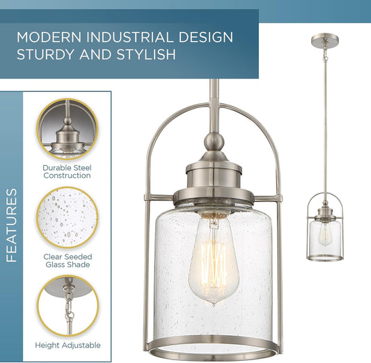 Quoizel Payson Mini Pendant Light, 7 Inch 1-Light Brushed Nickel, Clear Seeded Glass Pendant Light, Max Hanging Height 53", Ceiling Light for Kitchen Island, Dining, Hallway, Bar or Office