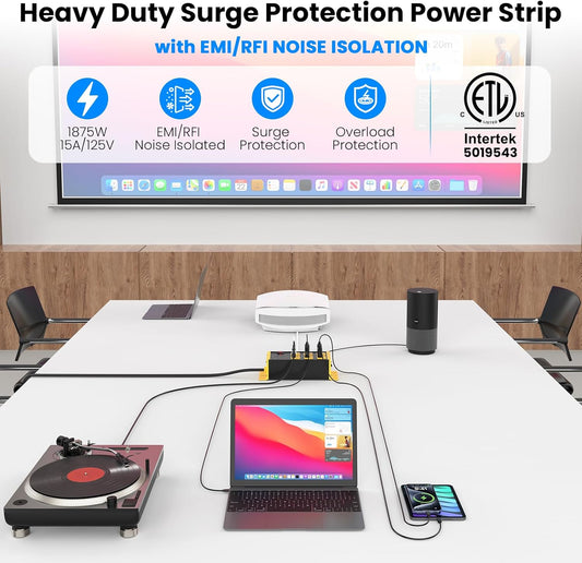 JUNNUJ Heavy Duty Power Strip Surge Protector 4800J, 6 Outlets with EMI/RFI Filtering and Noise Isolated Banks, Wall Mount Metal Multiple Plugs for Industrial Garage Shop, 6FT Extension Cord Flat Plug 6 FT Black