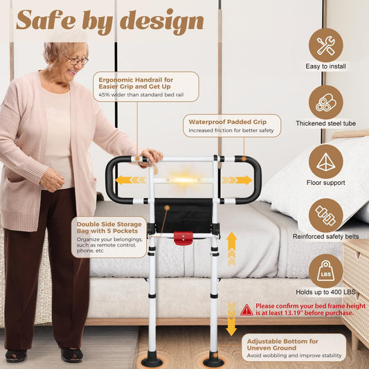 Folding Bed Rail for Elderly Adults with Motion Sensor Light, Adjustable Safety Assist Handle with Secure Straps, Heavy-Duty Bedside Support, Fits Bed Frames 13.58–19.88 in
