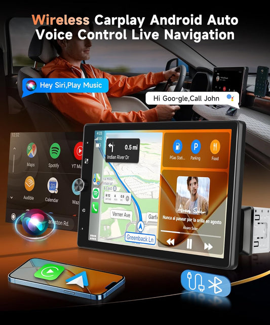 MAHVEC 10.4'' Single Din Car Stereo with Wireless CarPlay Android Auto, HD Rotation Touchscreen Radio with Bluetooth, USB, Mirror Link, SWC, Car Play, FM/RDS Radio, Backup Camera