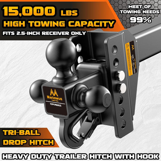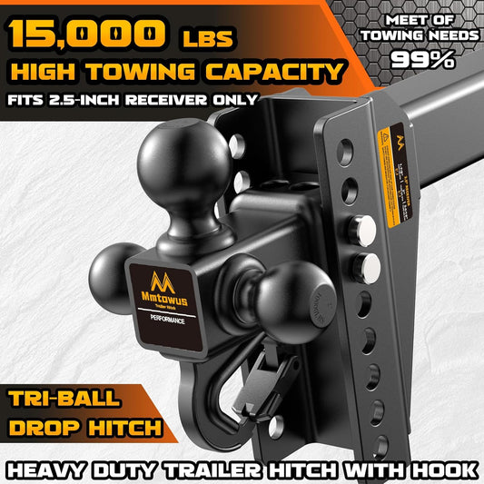 Adjustable Trailer Hitch -Drop Hitch -Tri Ball Mount w/Hook (1-7/8'', 2''&2-5/16''), Fits 2.5-Inch Receiver, 6'' Drop/Rise 15,000 LBS GTW Tow Hitch, 3 Ball Hitches for Trucks, RV, Camper etc