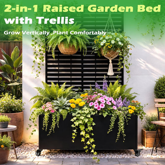 Metal Planter Box with Trellis, 43” L x 16” W x 71” H Raised Garden Bed with Wheels, Privacy Planters for Patio, Metal Planter Box with Drainage Holes, Black Black Slatted