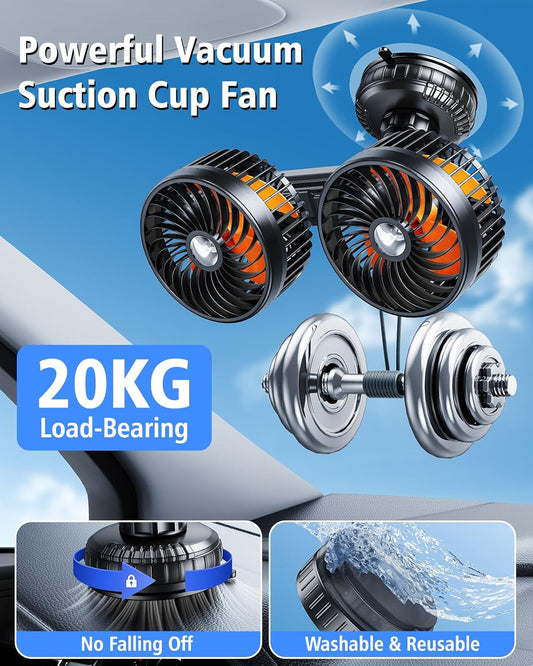 Dual Head Suction Cup Car Cooling Fan for Window Dashboard, 4000Mah Battery Powered Rechargeable USB Car Fans That Blow Cold Air, Cooler for Semi Truck Rv Van Tractor Cab Vehicles without Ac