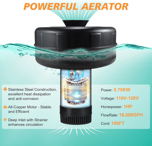 Pond Fountain Aerator, 1HP 750W 110V Stainless Steel, Floating Fountain with 100ft Power Cord & Rope & Timer