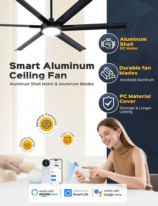 65 Inch Ultra-thin Smart Ceiling Fan with WiFi Alexa APP Remote Control,Whole Aluminum DC Motor and Blades,6 Speed,Modern Indoor Outdoor Patio Black Ceiling Fan Black - Aluminum Blades 65 Industrial