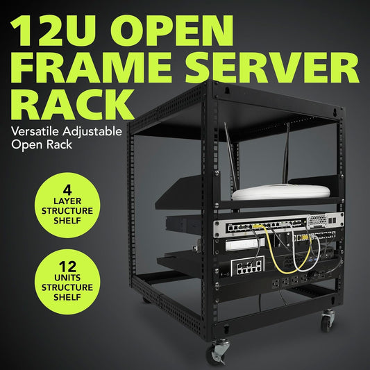 Pearington 12U Open Frame Server Rack, 23''-40'' Adjustable Depth, Free Standing or Wall Mount, 4 Post AV Rack with Casters, Holds Networking IT Equipment AV Gear Router Modem