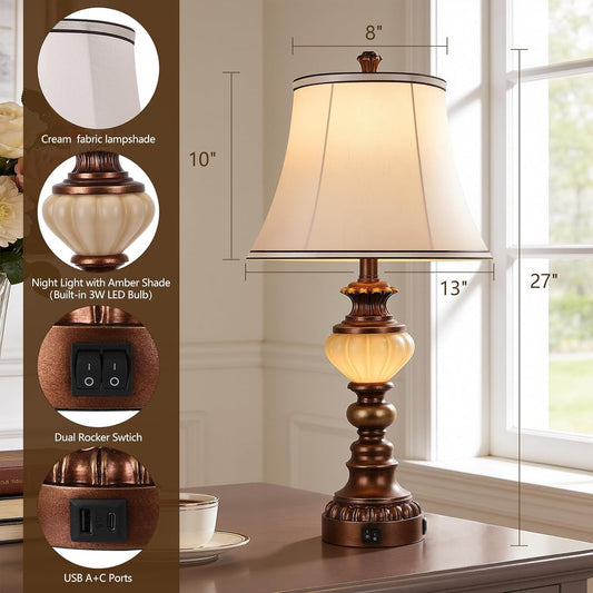 27' Farmhouse Tall Table Lamps Set of 2, Traditional Vintage Bedside Table Lamps with Nightlight and USB