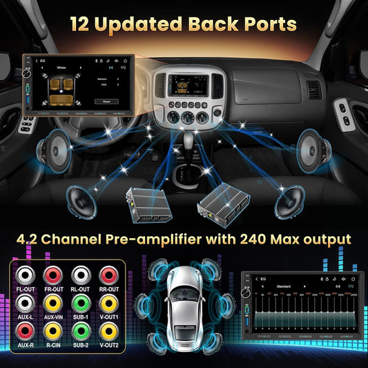 Double Din Car Stereo with Wireless Carplay & Android Auto - 7 Inch HD Touchscreen Bluetooth 5.3 Car Radio, 12 Back Ports 4.2 Channel Pre-Out, 30-Band EQ, SWC, Reverse Camera, Mirror Link