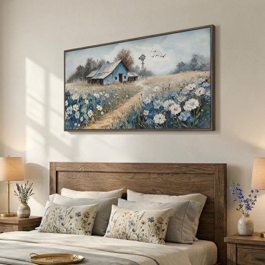 Large Framed Farmhouse Canvas Wall Art for Living Room, Vintage Rustic Barn Horizontal Canvas Prints, Country Blue Floral Wall Decor for Bedroom Hallway 30x60 Inch 60"L x 30"W Blue