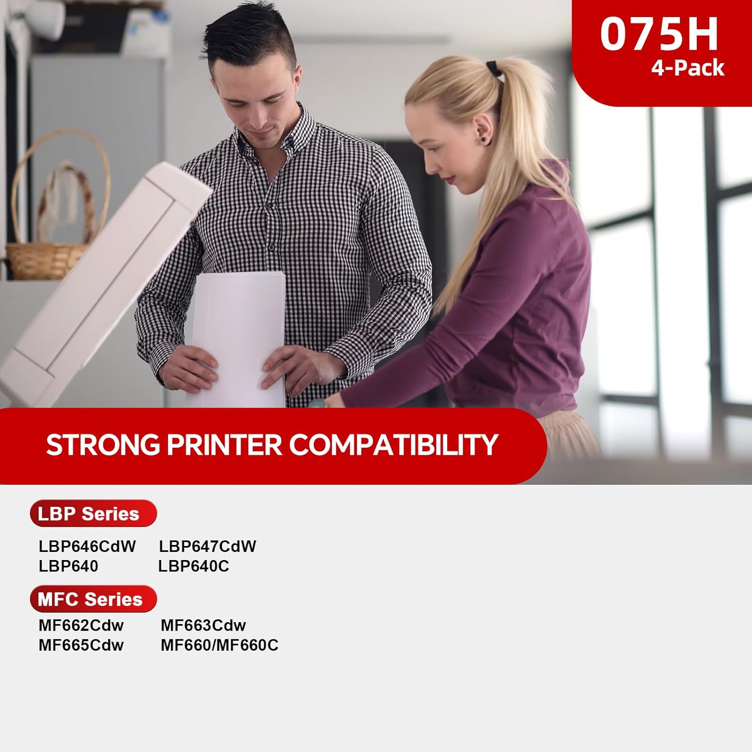 Perfect Compatibility with 075/075H Series:Our 075H toner cartridges come pre-loaded with chips that seamlessly work with 075/075H/crg-075 series printers, including the popular MF665Cdw,LBP646Cdw , LBP647Cdw ,MF662Cdw and MF663Cdw