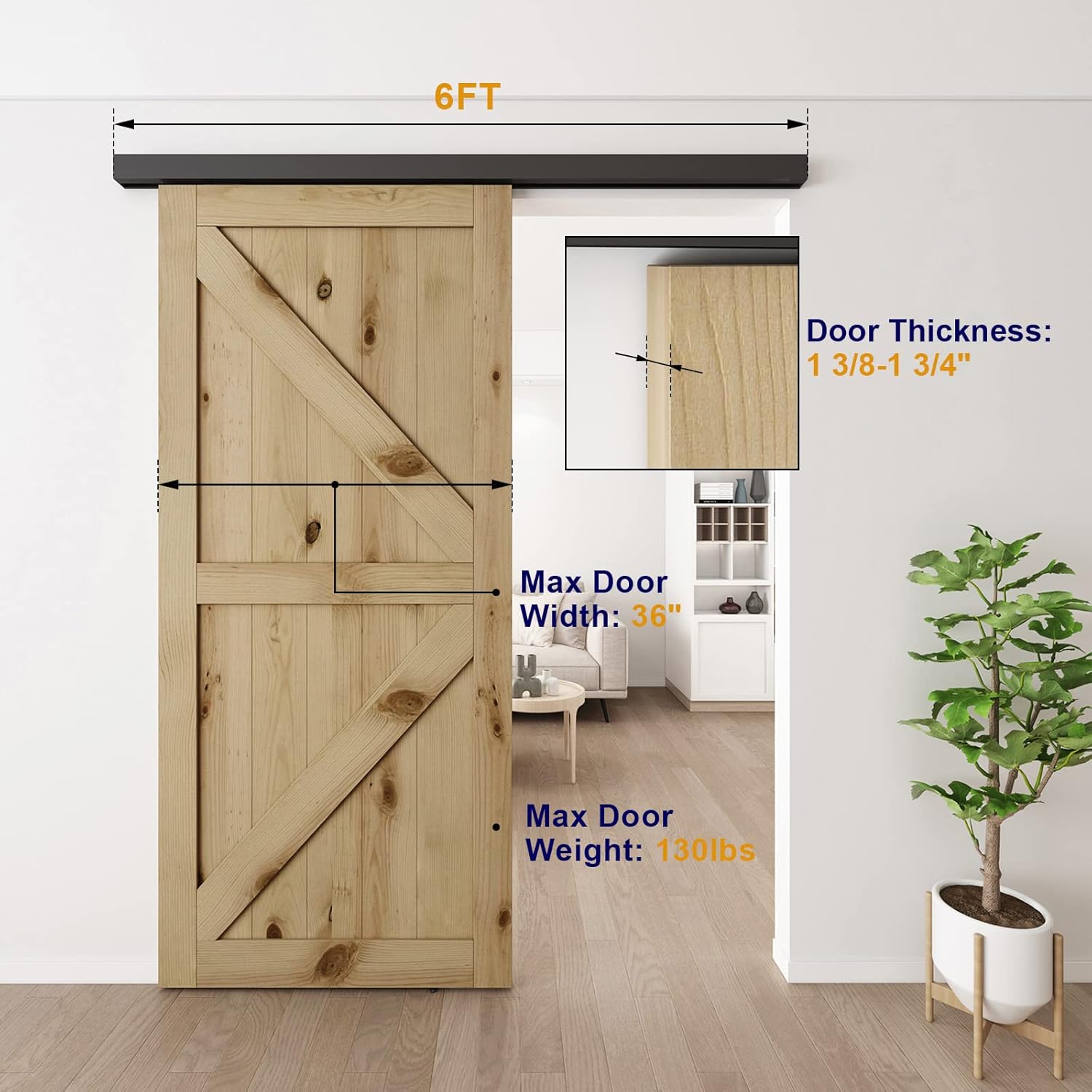 Size: Length of rail :6FT; Suitable thickness of wooden door panel: 1 3/8``-1 3/4``(35-- 45mm);Maximum bearing: 130lbs(60kg)