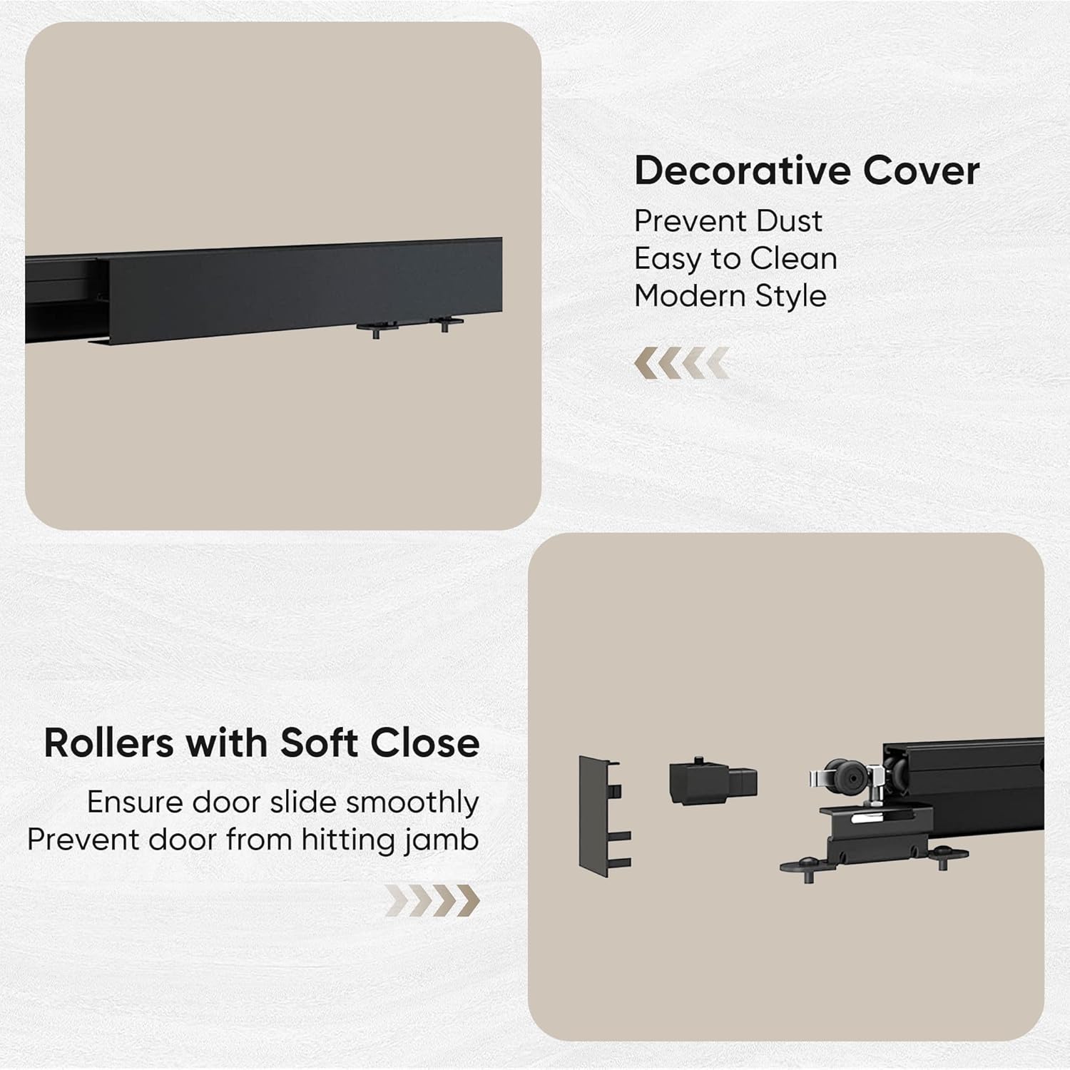 Pleasing Design :The guide rail is of one section type,no need to splice.The pulley is hidden in the rail,after you assemble your door with our box rail,the door and rail look integrated,simple and beautiful. The box rail is made of commercial grade aluminum alloy and is equipped with a soft closing mechanism ,it is quiet, soft and smooth when you open and close the door.