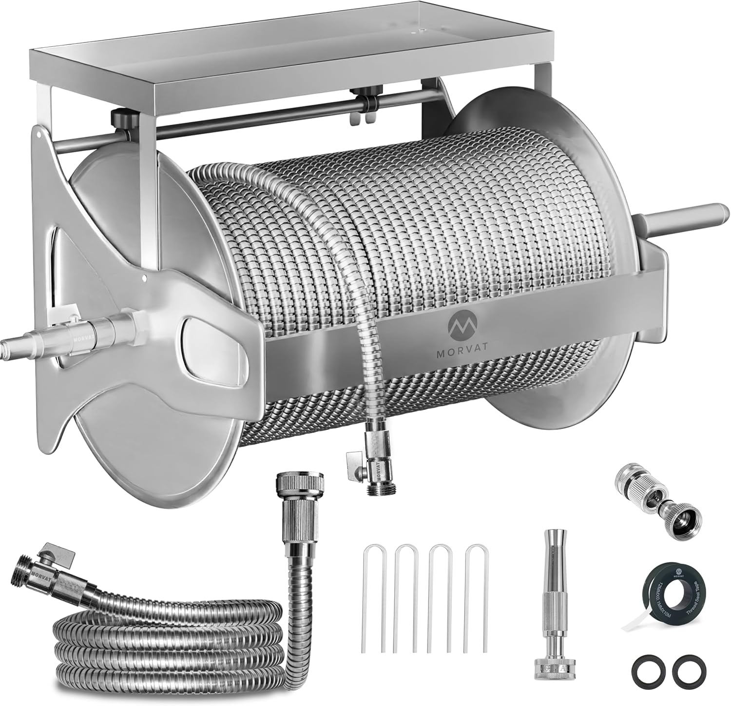 Morvat Stainless Steel Metal Water Hose Reel for 150FT Hose, Retractable Garden Holder with Storage Shelf & Crank, Wall/Floor Mount, Includes 100FT