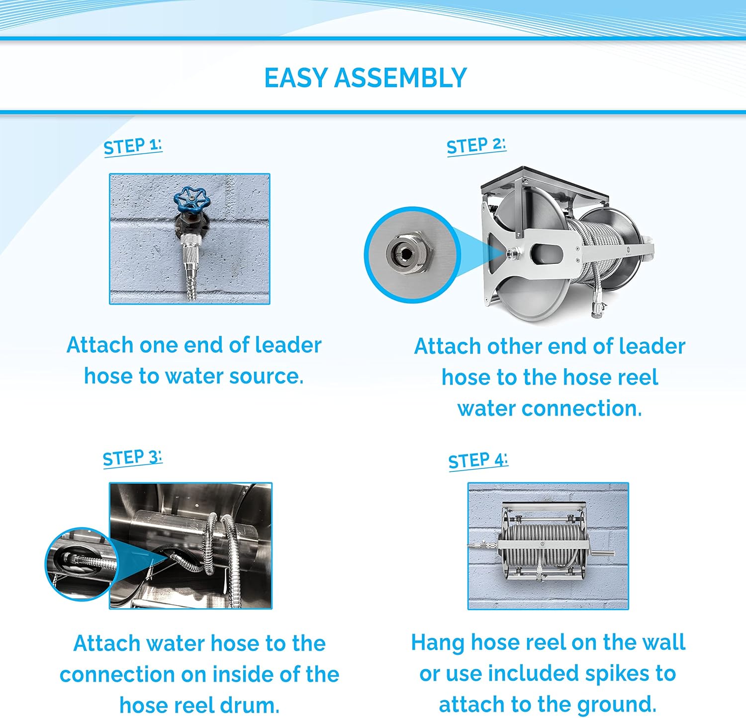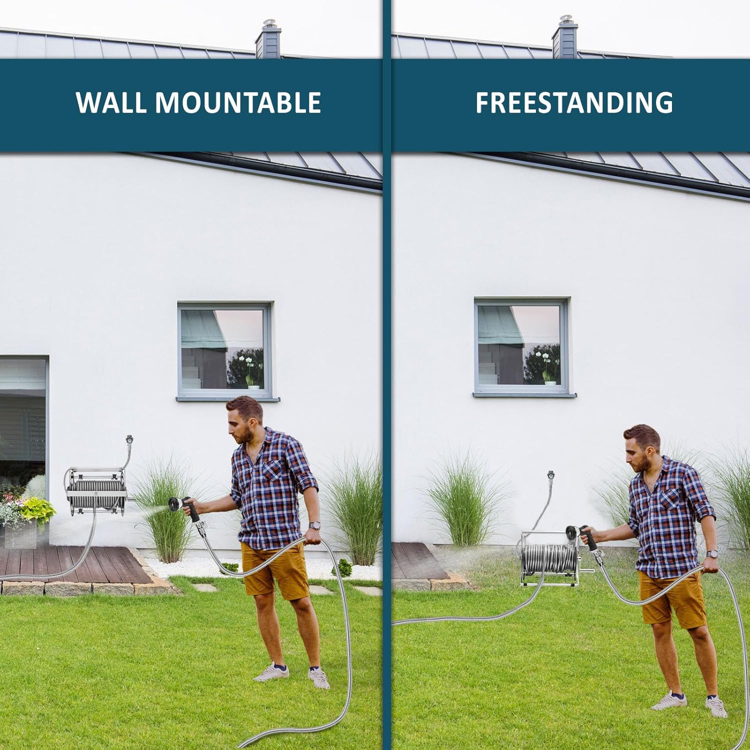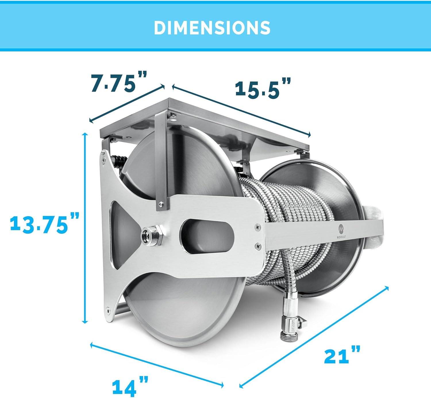 EXTREME DURABILITY- Made from 100% rust resistant stainless steel, this reel will last for years even when faced with high temperature & damp conditions. Enjoy a high pressure & leak-proof flow of water through the triple reinforced PVC inner stainless-steel hose. Has a PSI of 115 for safe use and up to 345 burst pressure.