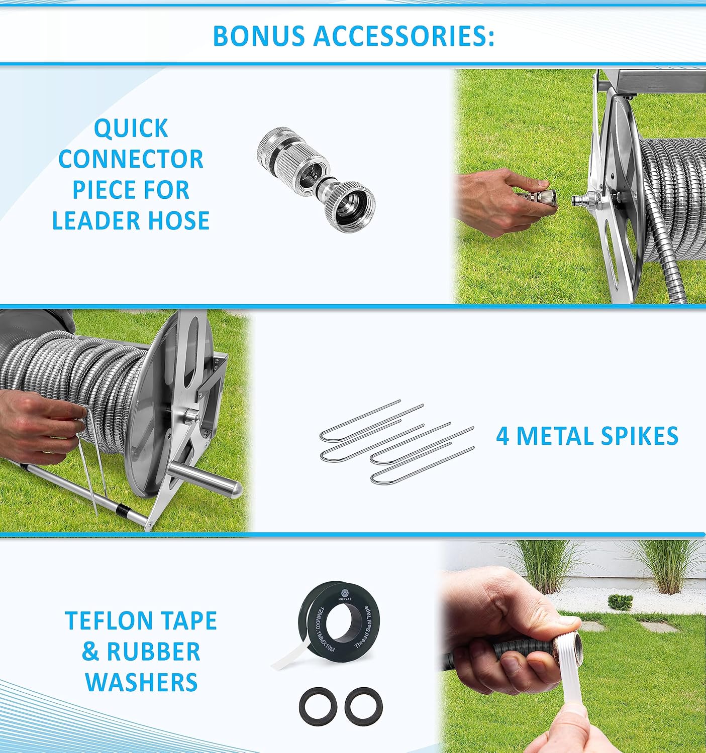 COMPLETE SET- 100FT Stainless Steel Hose with ON/OFF Shut Off Valve, 5FT Leader Hose with ON/OFF Valve, Nickel Plated Brass Nozzle, Quick Connector, Teflon Tape, Rubber Washers & 4 Metal Spikes.