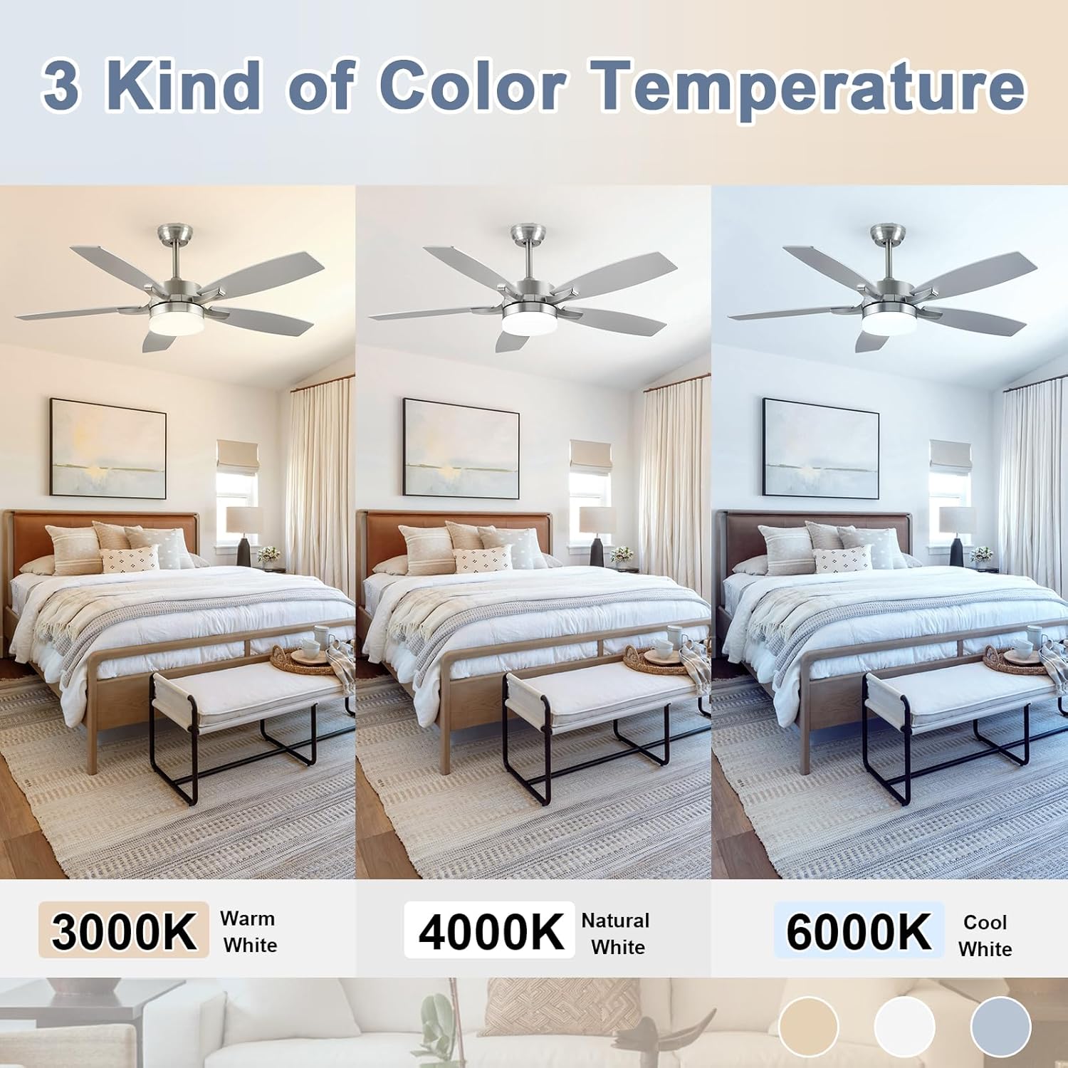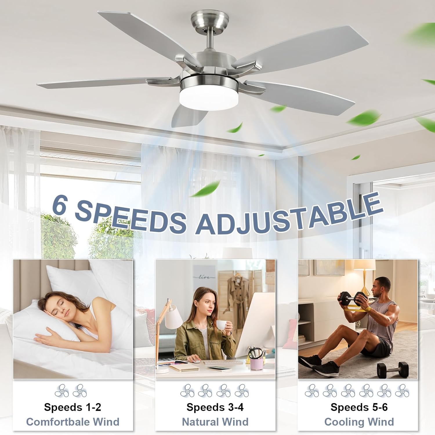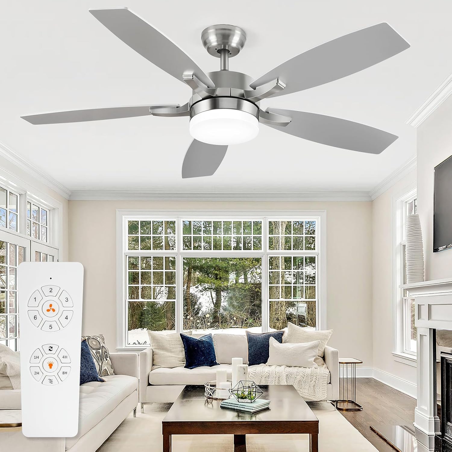 Ceiling Fans with Lights, 52 Inch Silver Ceiling Light with Fan and Remote Control, Quiet 5 Blades 4 Timer 6 Speeds