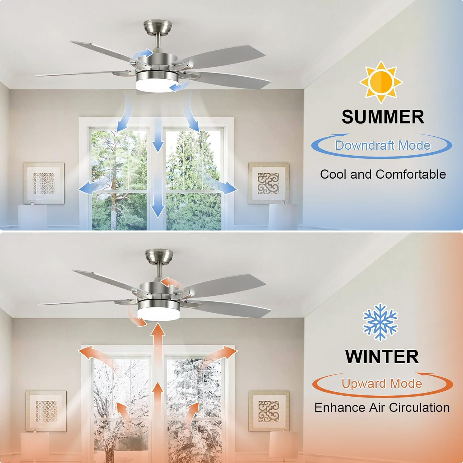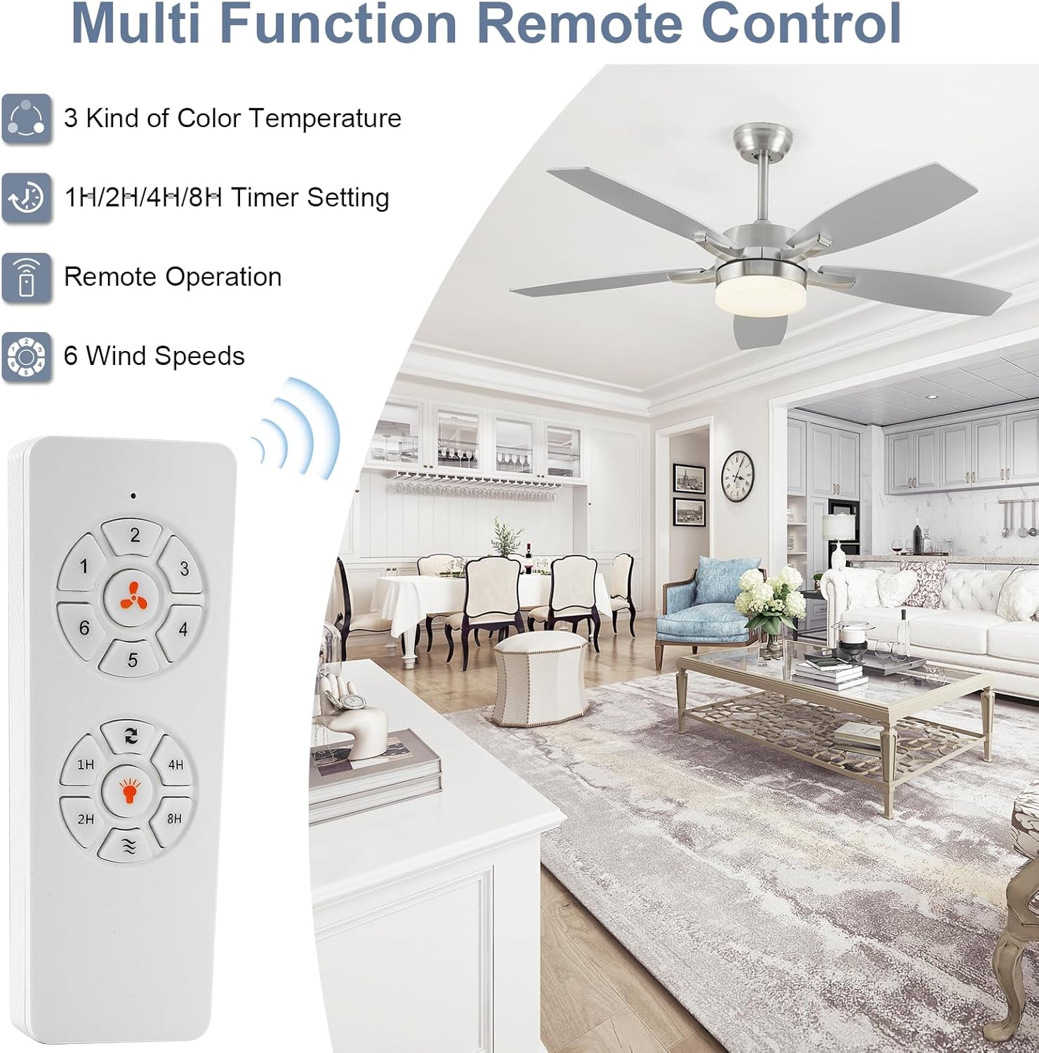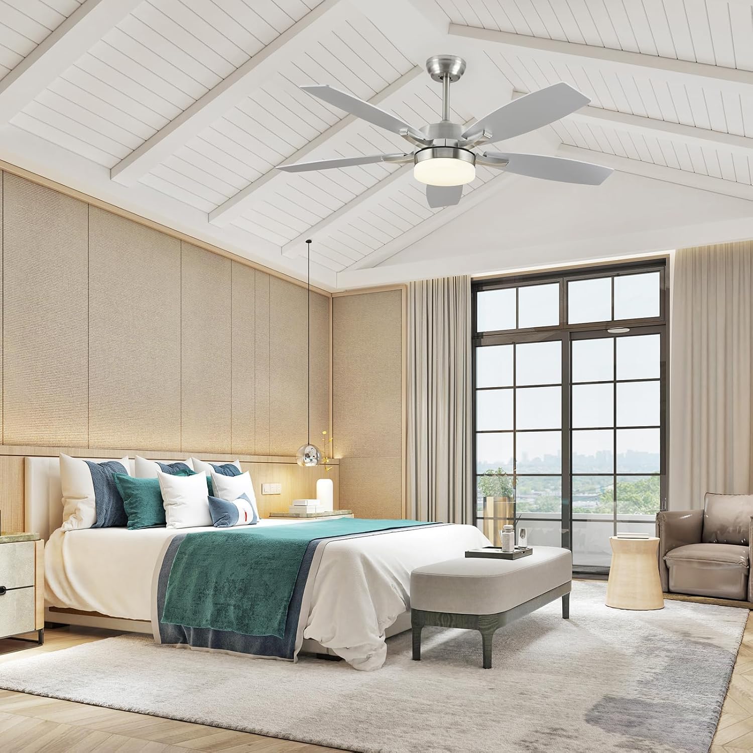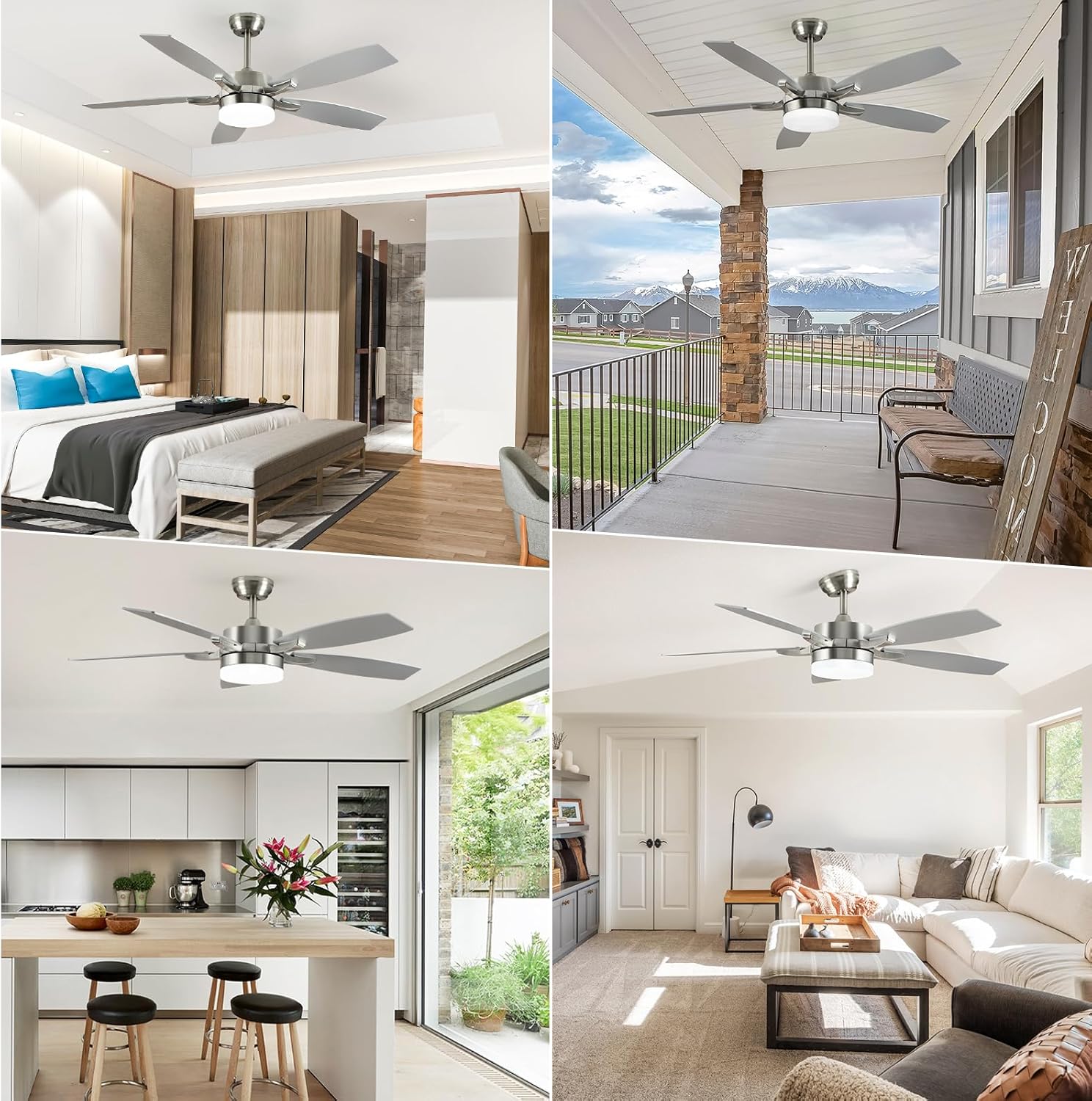 Ceiling Fans with Lights, 52 Inch Silver Ceiling Light with Fan and Remote Control, Quiet 5 Blades 4 Timer 6 Speeds