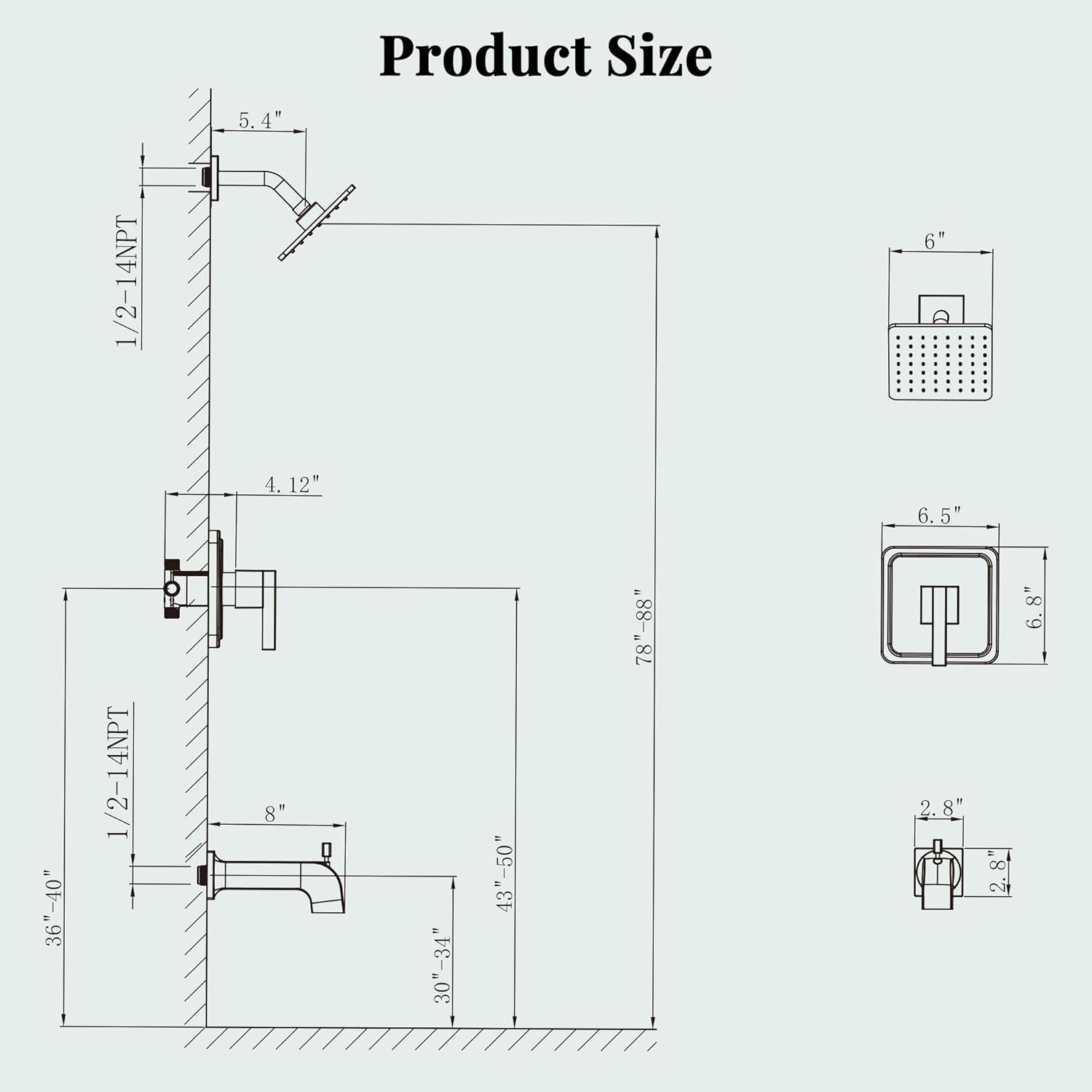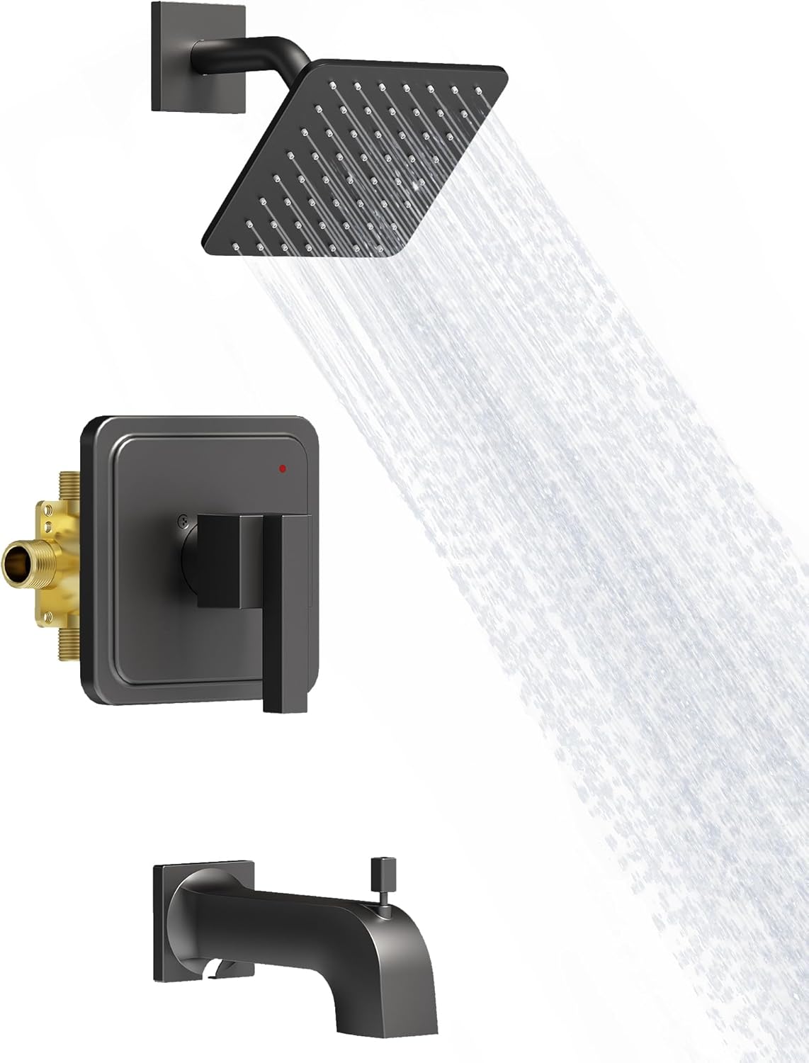All-In One Tub Shower Faucet: Comes with a shower valve, 6-inch rain shower head, 6-inch shower arm, and 7-inch tub spout with diverter for a fully integrated and stylish shower solution