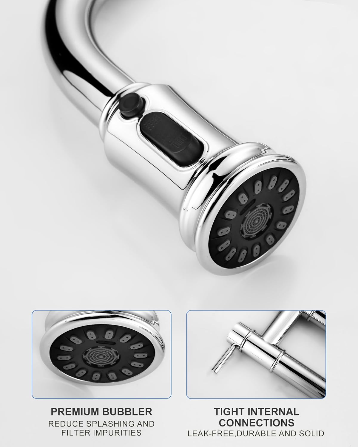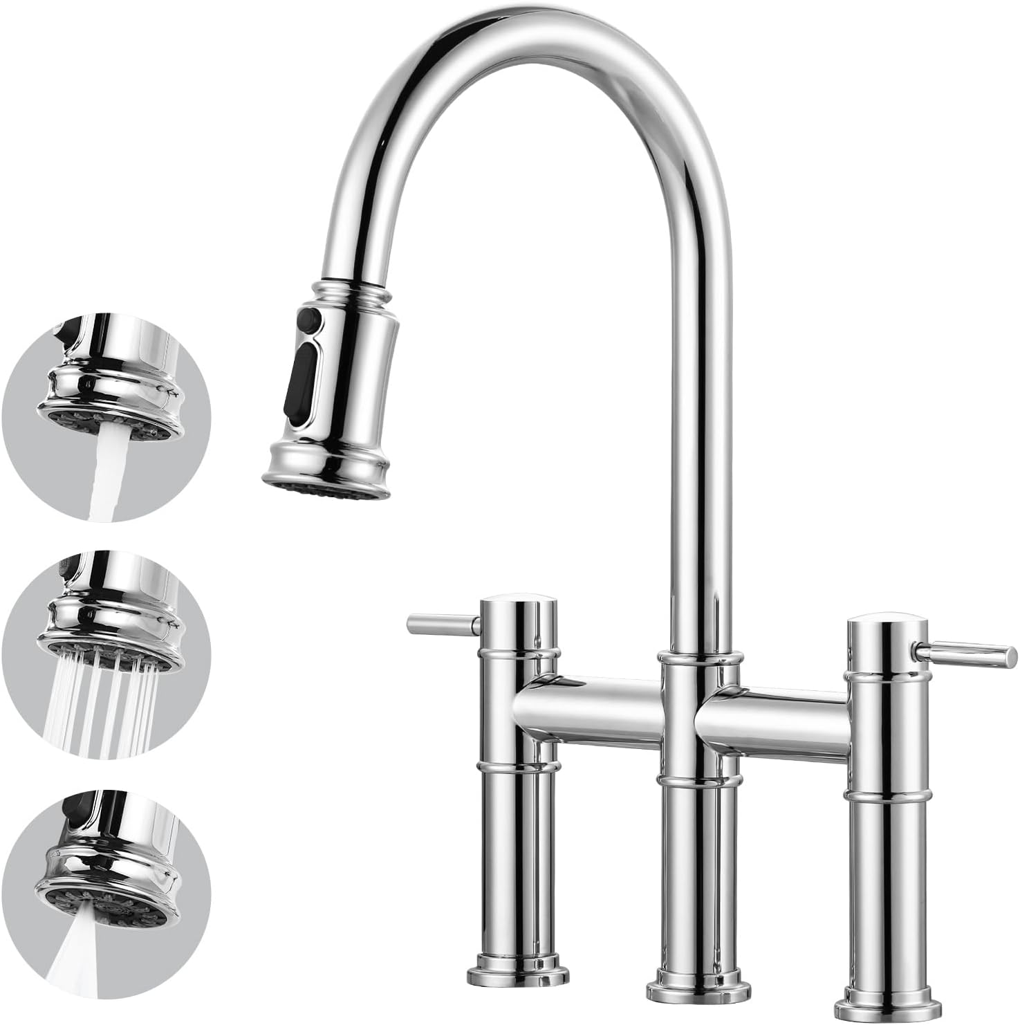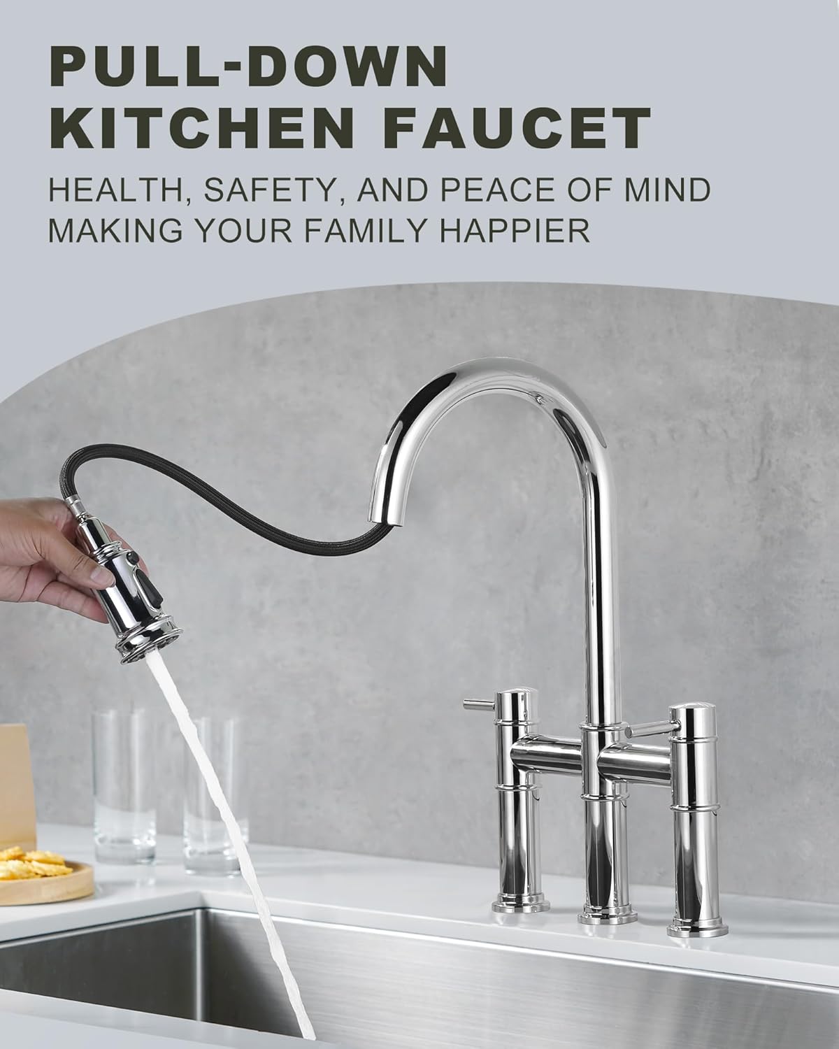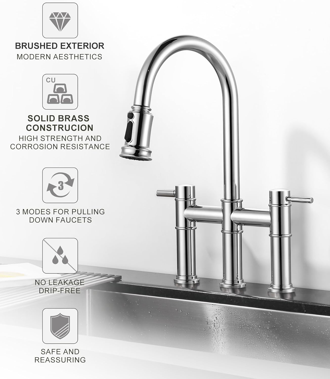 PREMIUM KITCHEN FAUCET WITH SPRAYER: The Bridge Kitchen Faucet main body is composed of copper, stainless steel bends, and plastic shower heads. Also paired with a 1.5-meter pull-out tube with a nylon woven EPX inner tube. Our kitchen faucets for sink 3 hole with a pull-down sprayer’s bubbler can effectively filter impurities and reduce splashing. COPPER CARTRIDGE - leak-free, durable and solid. Which will meet the demand for high-quality faucets