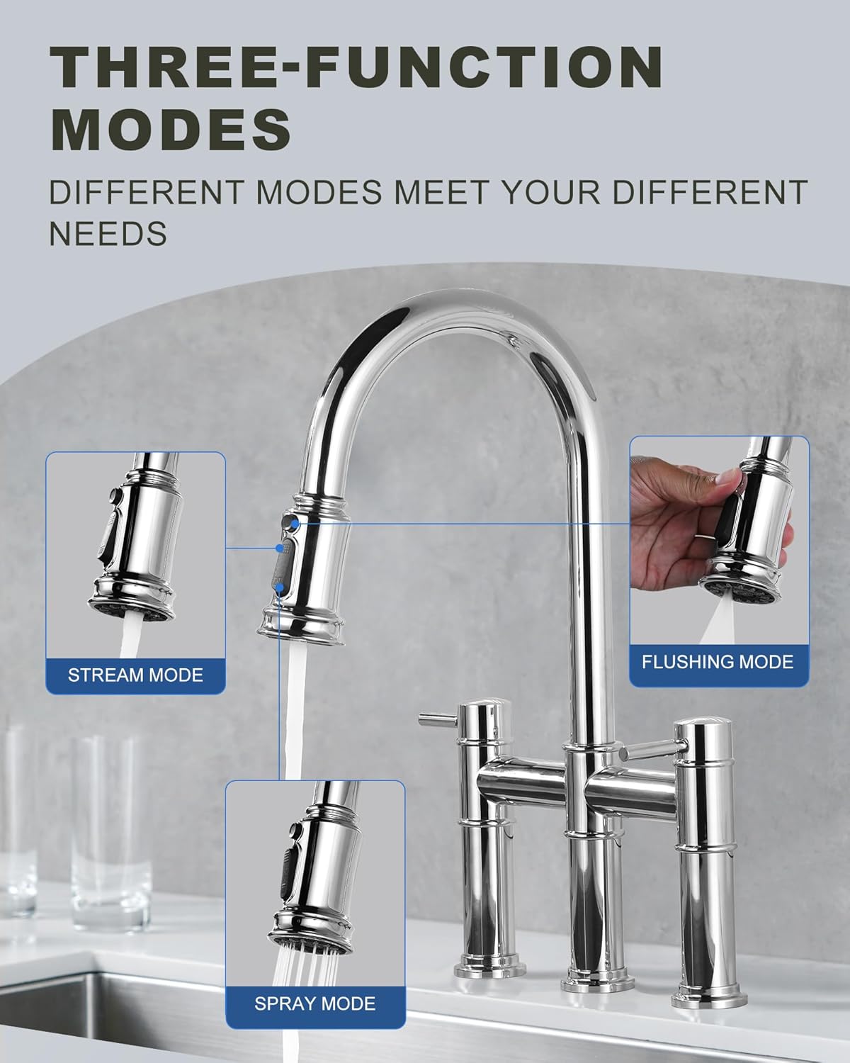 The smooth, chrome finish bridge kitchen sink faucet features stain-resistant and resistant to corrosion and fading. The high arc gooseneck spout kitchen faucet with 360° swivels , allowing you to reach every hard-to-reach corner of your kitchen sink. You will never regret getting it. In addition, we offer a limited lifetime warranty and 24-hour customer service support, please feel free to contact us if you have any questions
