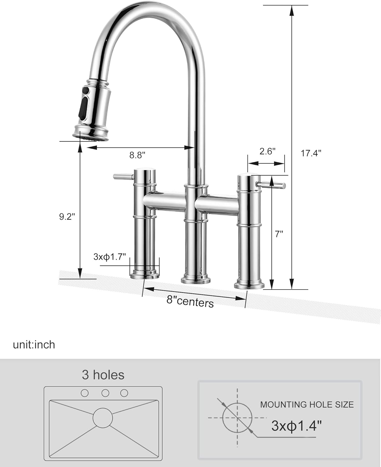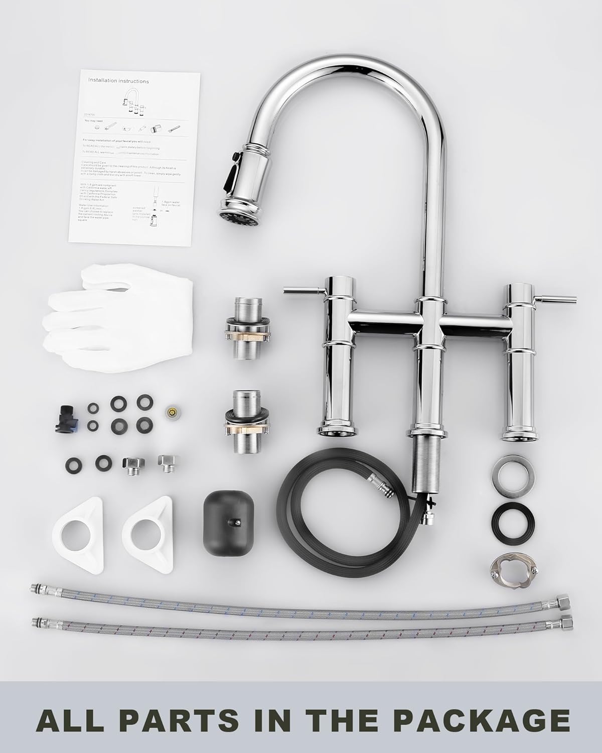 Bridge Kitchen Faucet with Pull Down Sprayer: Chrome Kitchen Sink Faucet 3 Holes 2 Handles with Supply Lines, 8.8 Inch Deck M