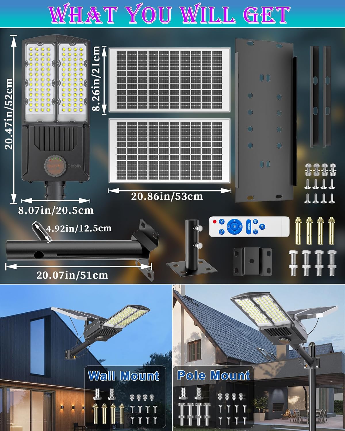 Solar Powered & 0 Electricity Bill — Gefolly SL-7500W solar security light is built-in 104pcs 5054 ultra bright LED lamp beads and 30000mAh battery (lifetime up to 65,000 hours). Provides a 6500K, IP67 waterproof rating, and works normally even in bad weather all year round. Solar powered, no electricity bill, auto turns on at dusk and charging during the day, Continuous lighting up to 30 hours (when fully charged). Best for commercial and home lighting. Note: The remote controls that come with the light are available in white and black. The white and black remote controls are shipped randomly.