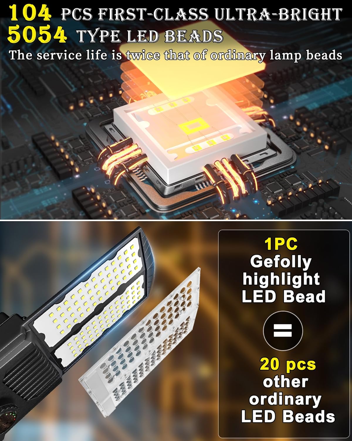Super Bright 5054 Type Led Beads & Motion SensorDesigned with 104pcs first-class super bright 5054 type LED beads,1 of our Gefolly beads is as bright as 20 ordinary beads. The lighting area is up to 3200 square feet, reducing lighting blind spots. Escort for the safety of you and your family. Built-in motion sensor, meeting various lighting needs. The first choice for night lighting.