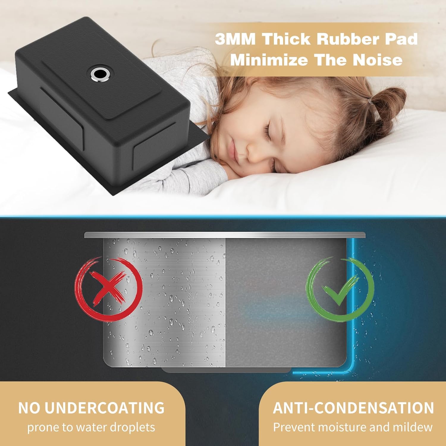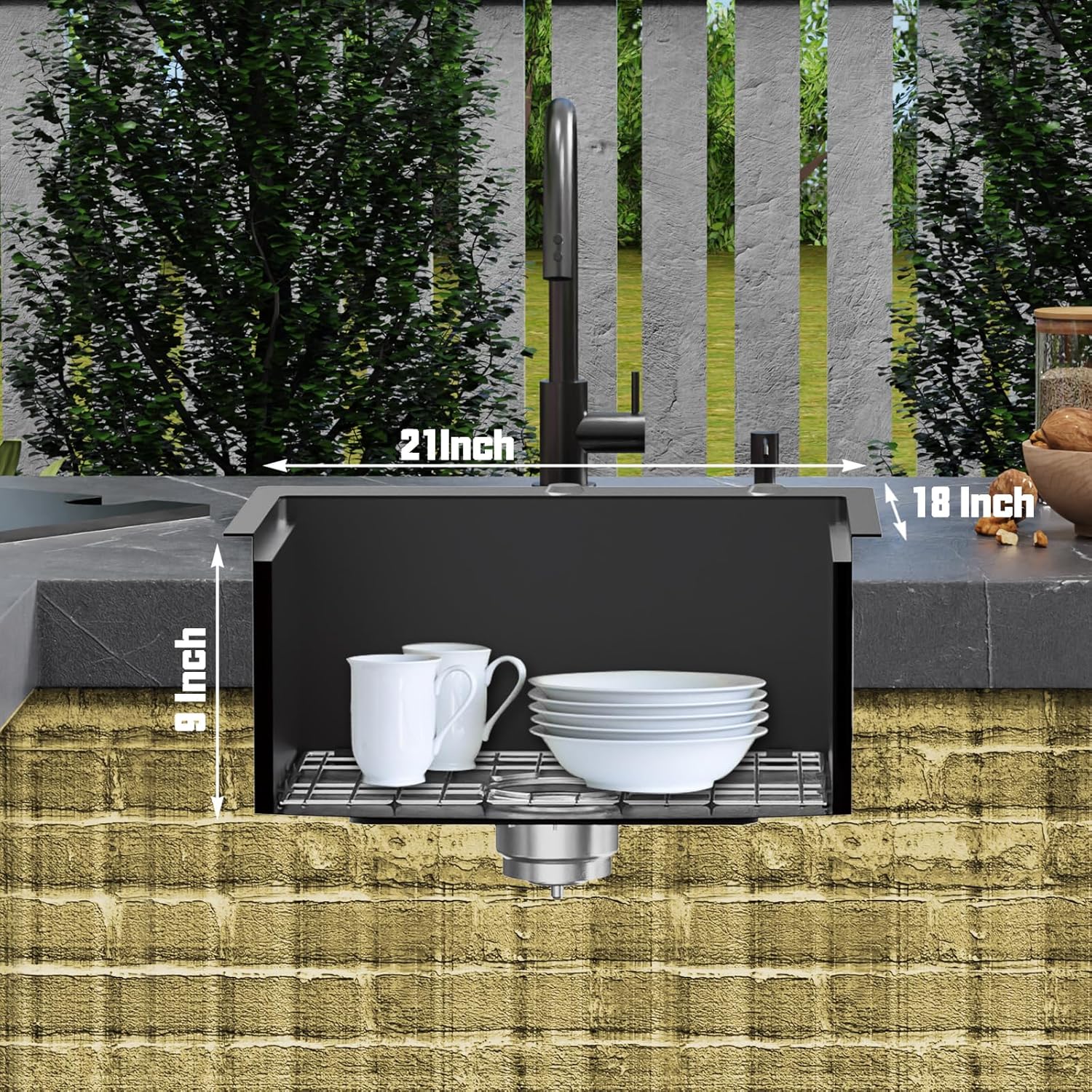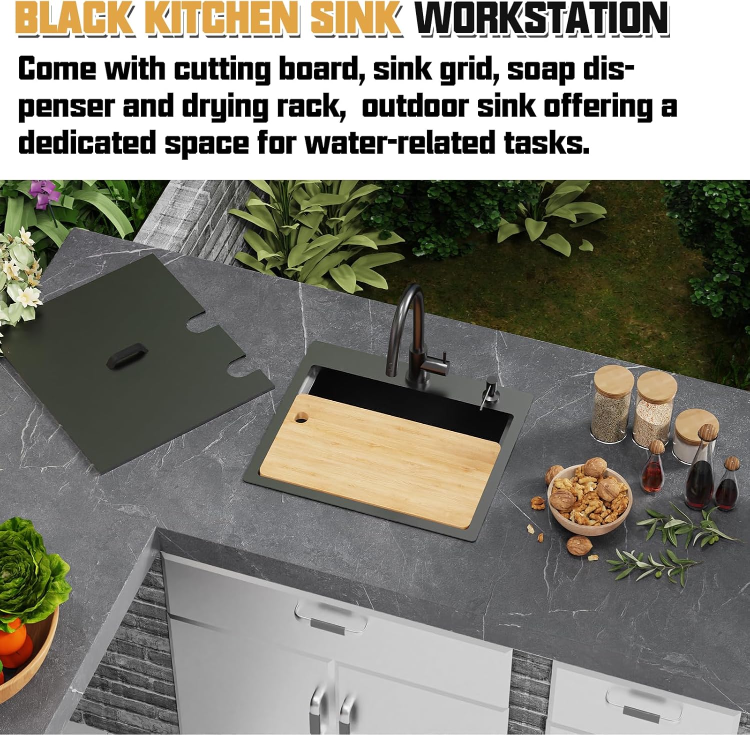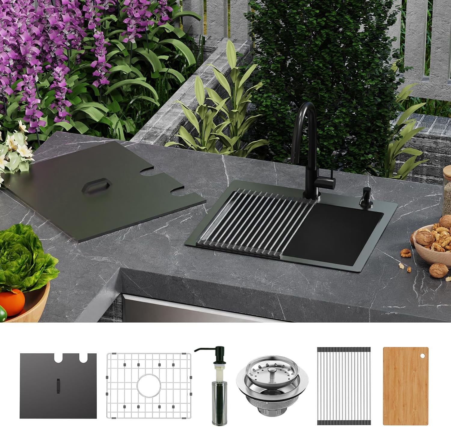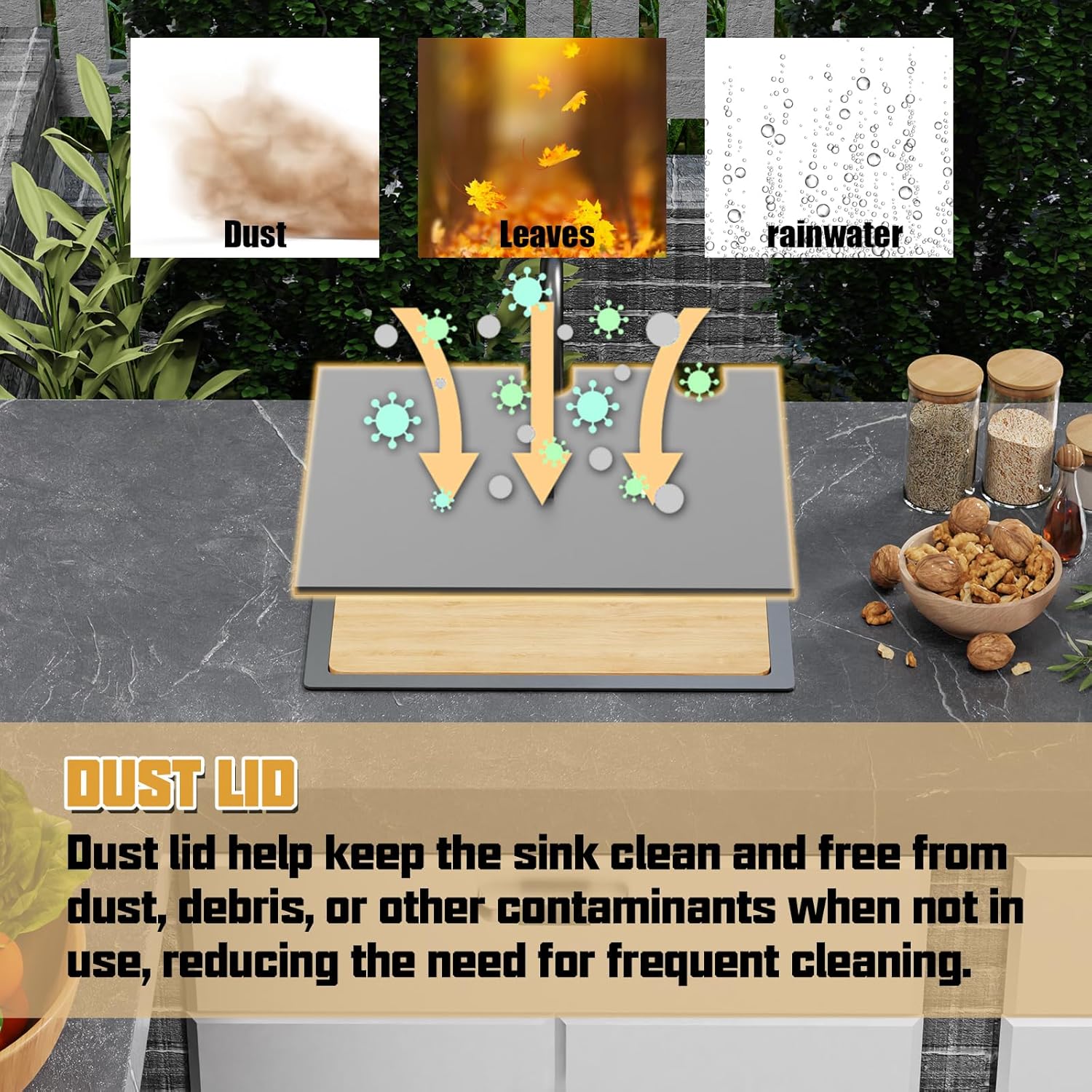 Dust Lid: 21x18in black kitchen sink come with dust lid that helps protect the sink from debris, leaves, and rainwater when not in use, keeping it cleaner and ready for the next cooking session. Dust lid is designed for easy placement and removal, allowing to quickly put it on or take it off as needed, nicely for outdoor kitchen.