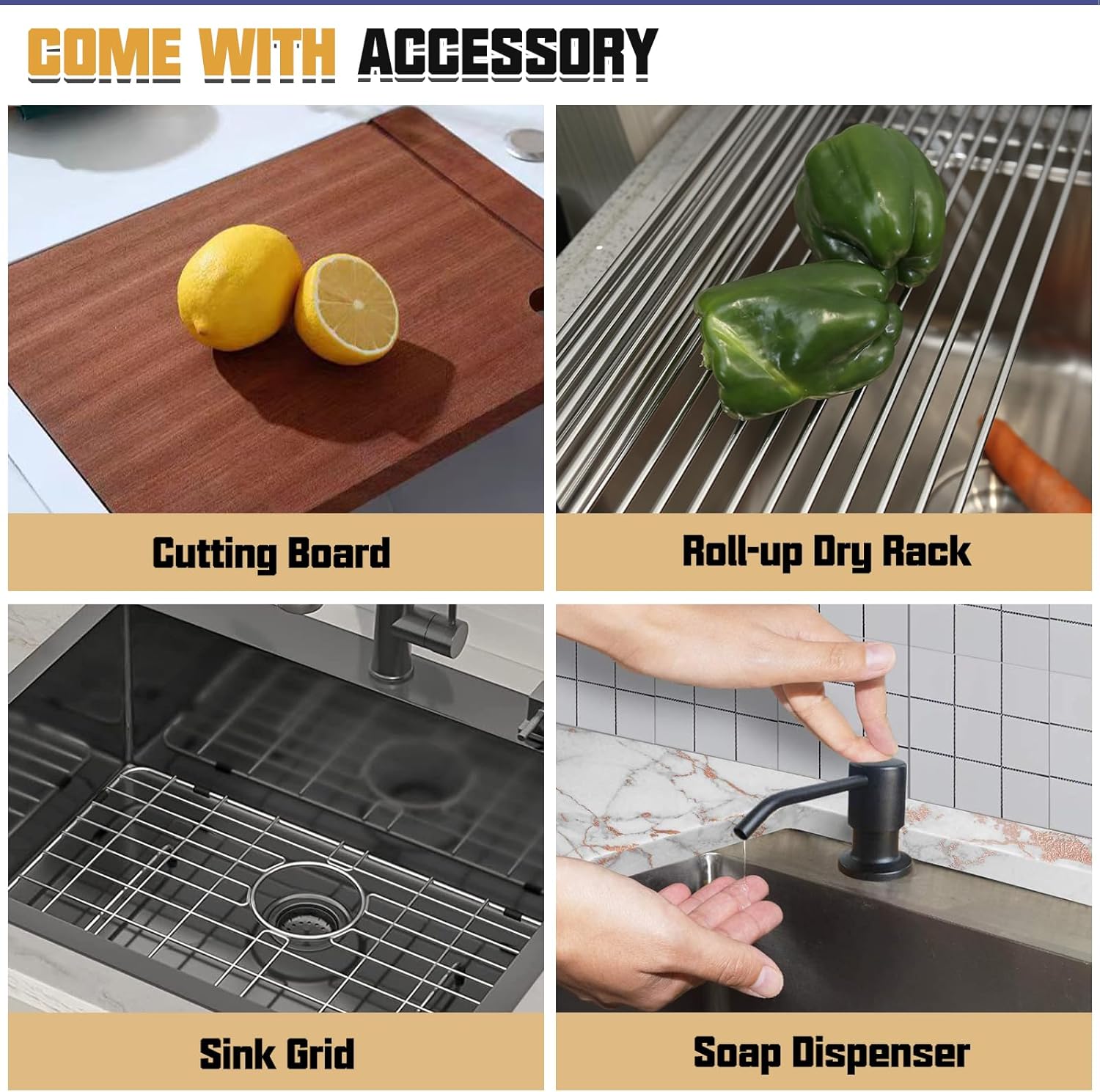 Built-in Ledge: Come with accessory-cutting board,drying rack, soap dispenser, sink grid and drain assembly, stainless steel black kitchen sink workstation allows for seamless integration of accessories to accommodate different tasks and preferences. Built-in ledge design promotes better organization in the kitchen.