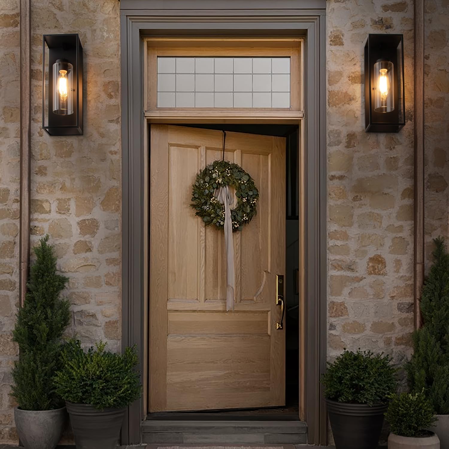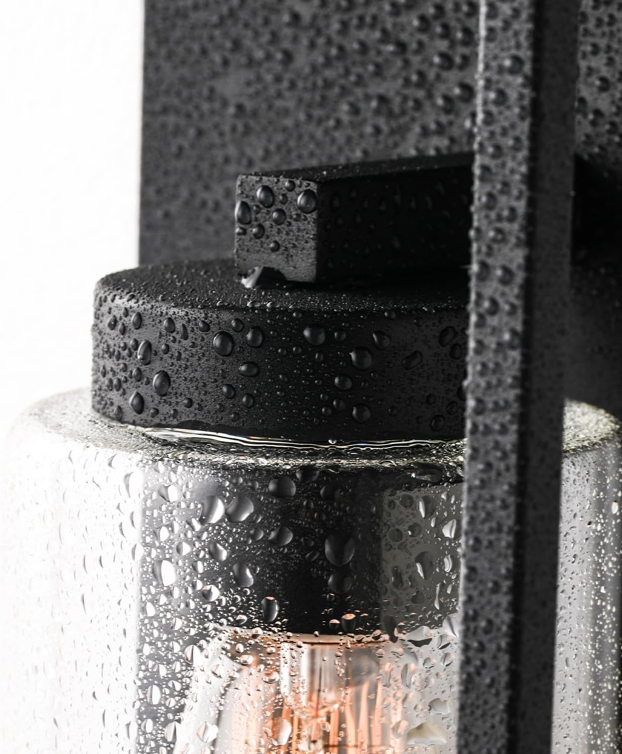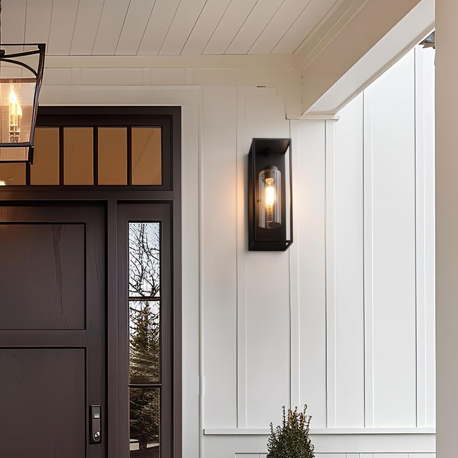 Matte black finish and clear glass panels maximize the vintage character of this wall sconce