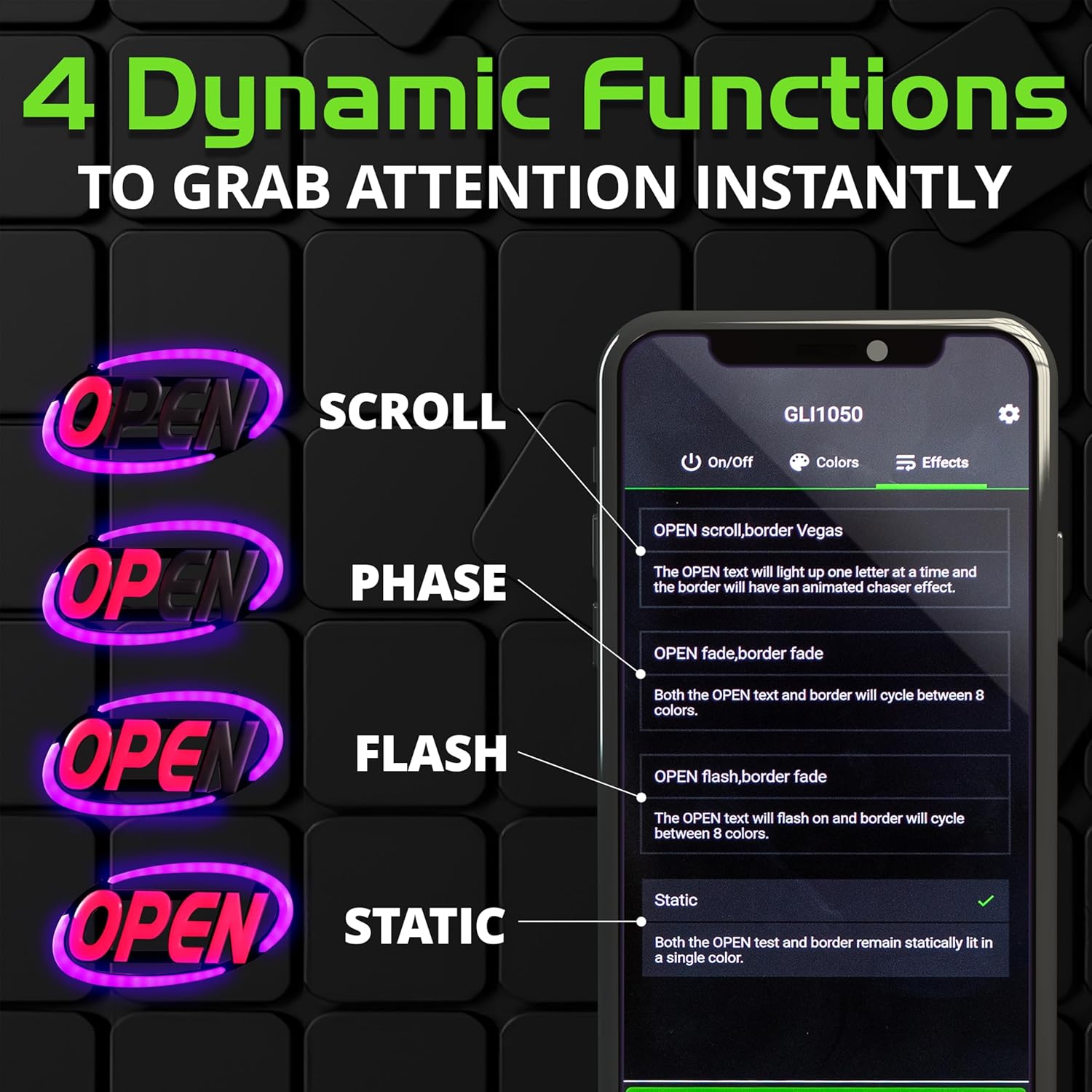 Static, Scroll, Flash, Phase… this LED open sign has 4 dynamic functions to catch the eye of passers-by, so they see you’re open for business