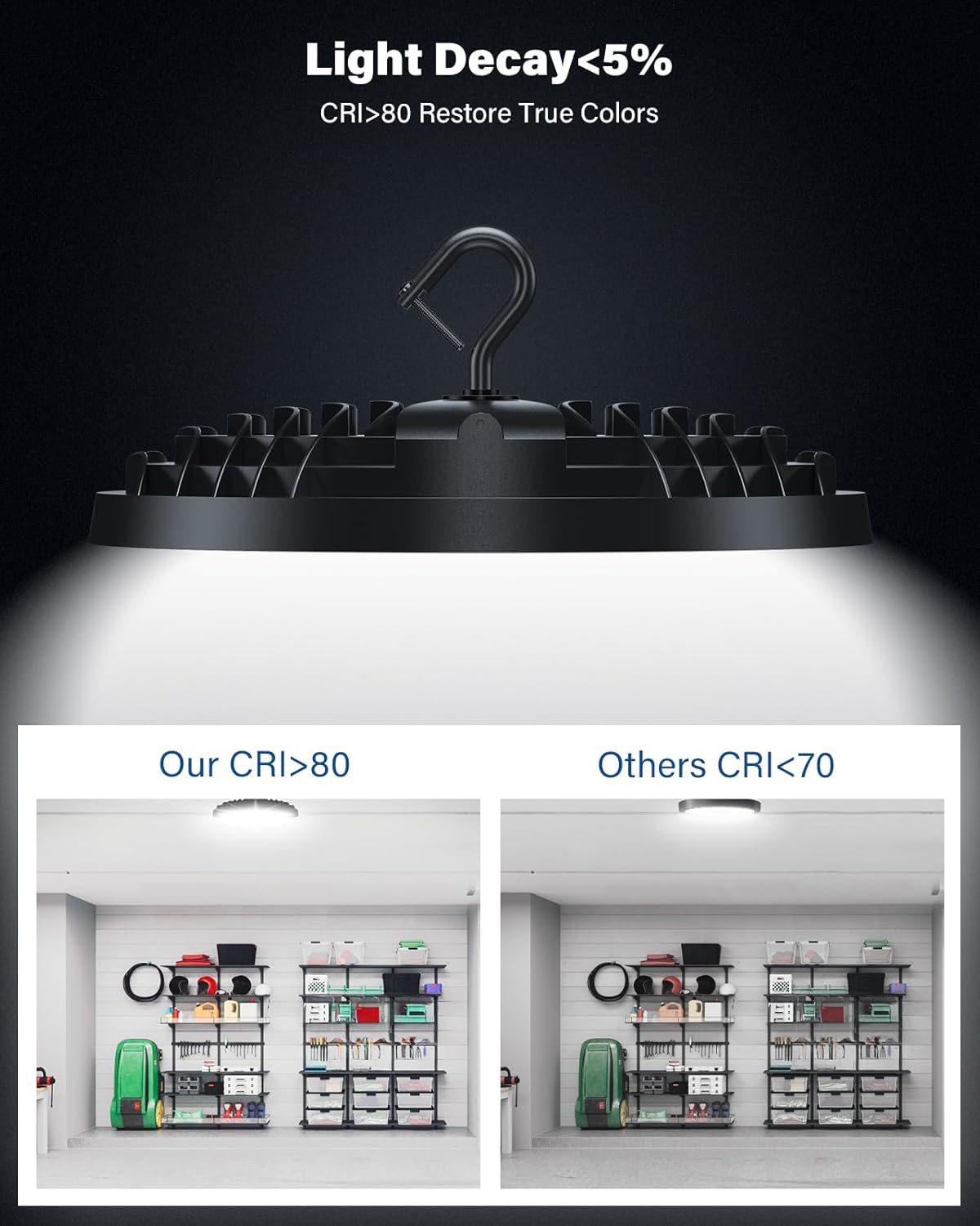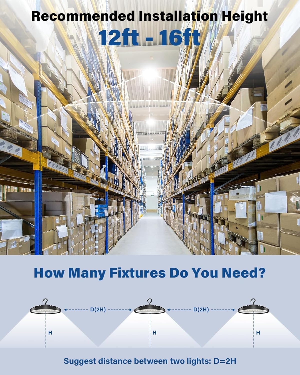 Quick and Easy Installation: This UFO LED High Bay Light features an American-style hook and a 5-foot power cord with a 3-prong plug, making it plug-and-play ready. Save time and effort with a hassle-free installation process, providing a convenient and efficient lighting solution.