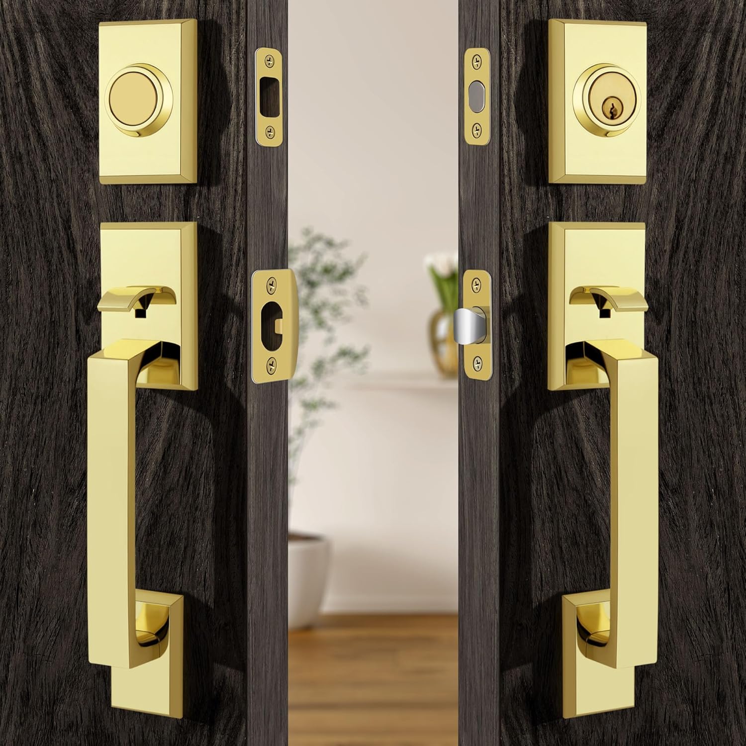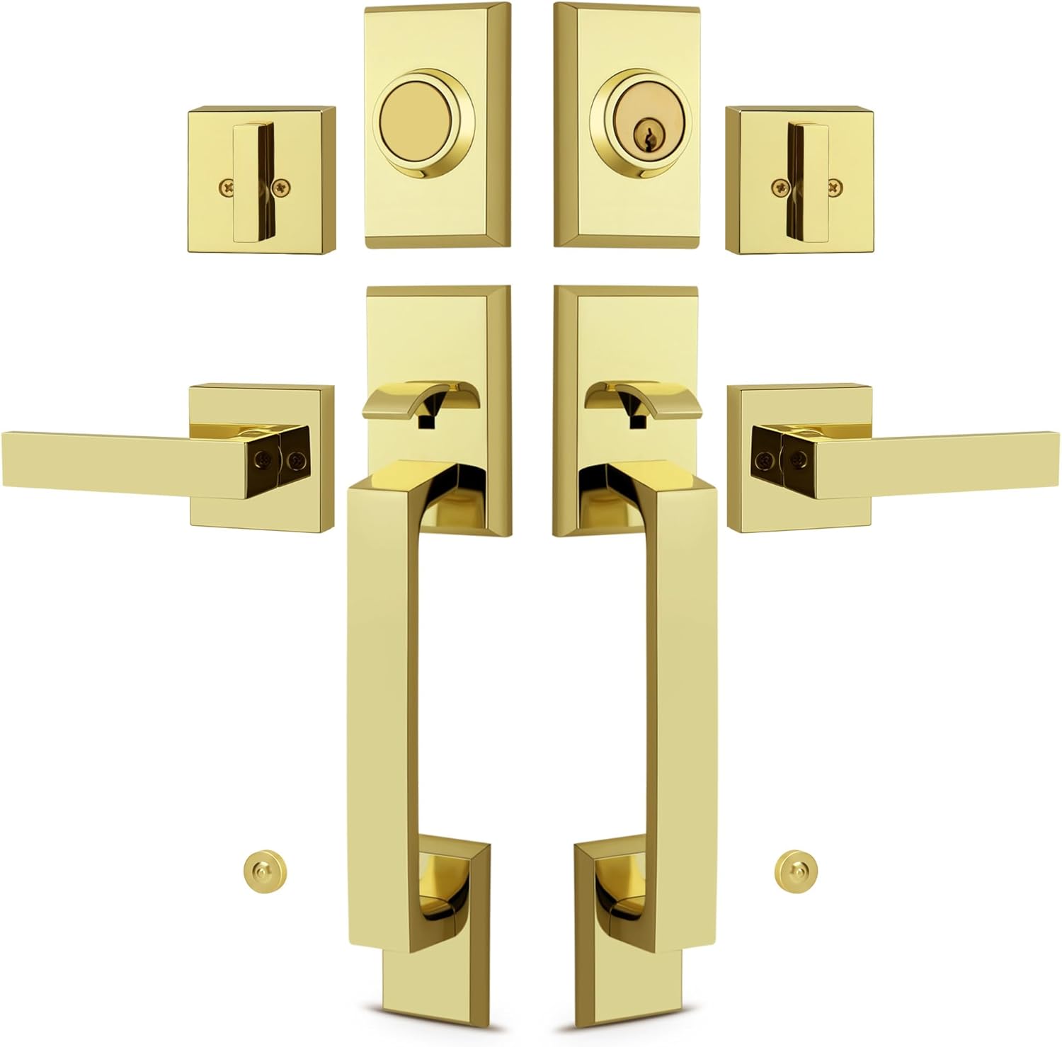 Double Front Door Lock Set, Polished Brass Square Front Door Hardware Set with Dummy