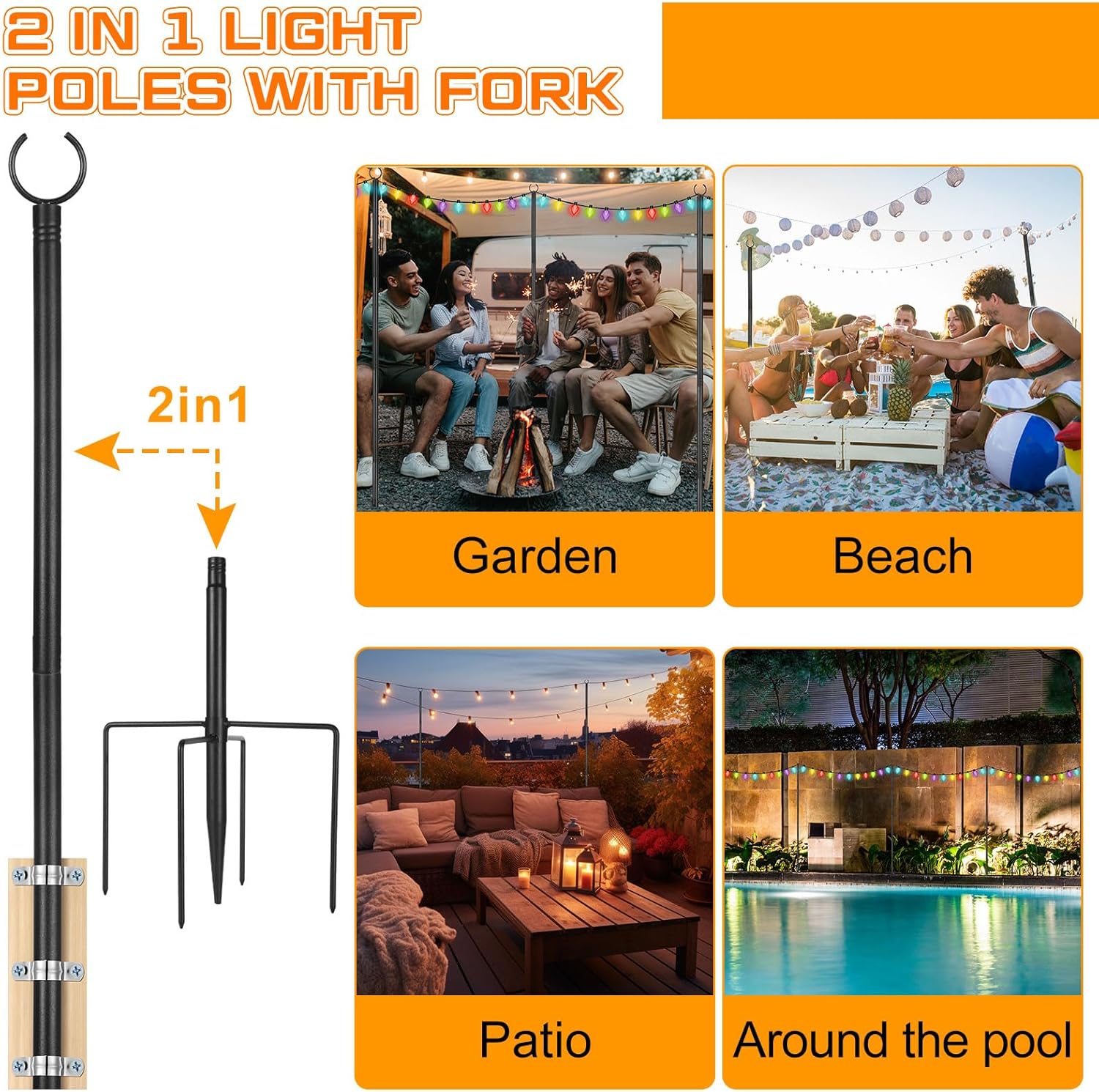 2 In 1 Light Stringer Pole: our outdoor light poles for yard are designed with multiple sections and a spiral design in the center section, you can finish the installation faster, once assembled, you can use the external fixing clips to fix it to the deck and fence; Or simply insert the metal fork into the soil to secure it