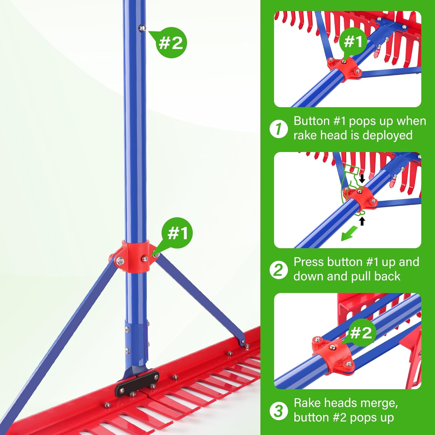 – & :Use rake as a floating rake with the attached float and rope for surface weeds, or remove the float to organic matter on the bottom of water. The included 26-foot poly rope ensures durability and easy retrieval.Triple-stage quick-release handle design,total length 11ft,Used together with a 26ft long rope for easy pitching and retrieval to give the rake a wider reach and efficiently deal with weeds in the center of the lake