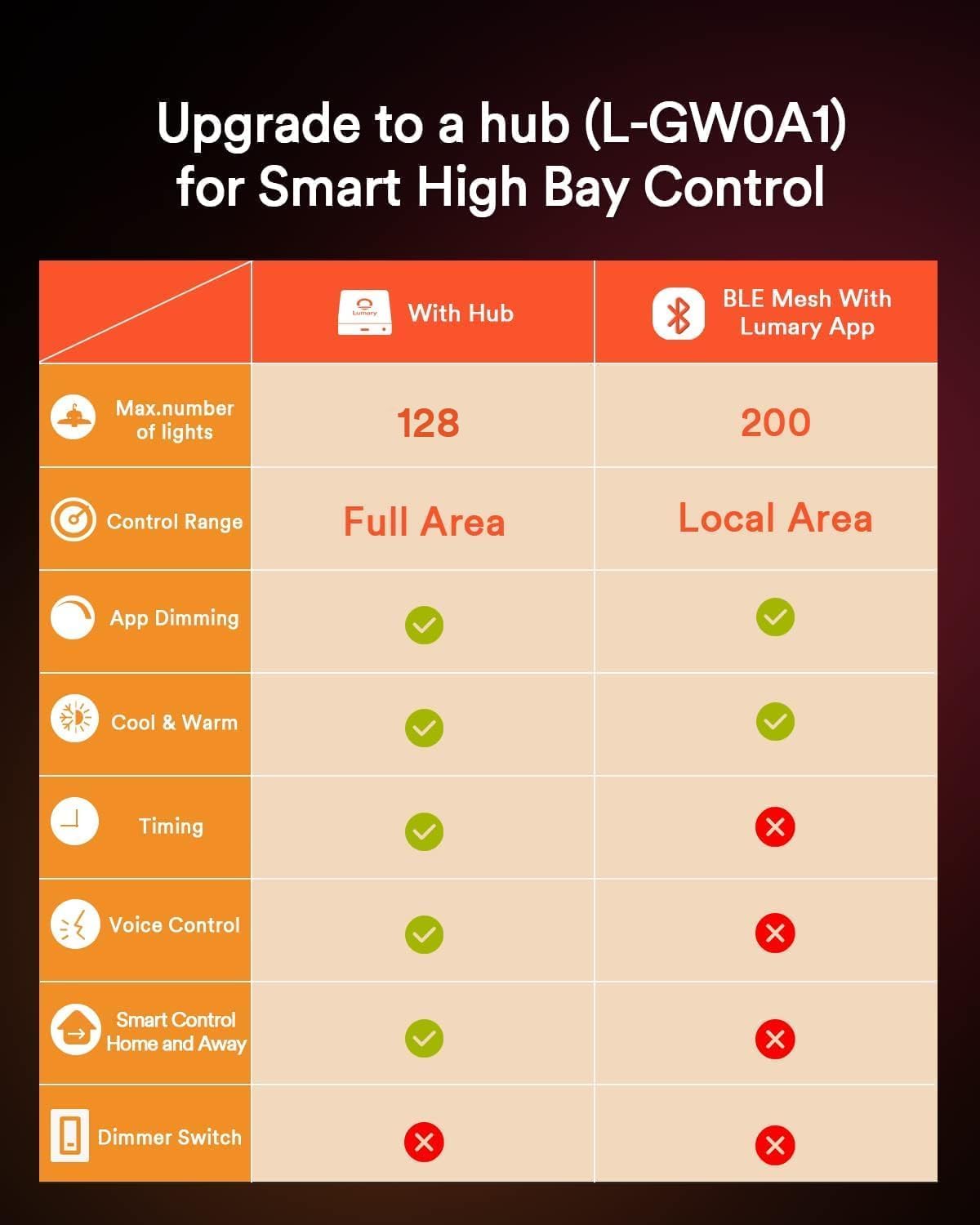 Smart Home & Away Control: With a Lumary hub L-GW0A1, Lumary high bay led light work with Alexa/Google Assitant, Whether you`re at home or away on vacation, it can be controlled remotely or automatic operation due to your schedules on Lumary APP. Manage your shop, barn, basement, gym, warehouse, showrooms, and logistics centers with ease via hub L-GW0A1. No worries forgot leave the lights on—simply turn them off remotely. Save energy, reduce costs, and enjoy the convenience of smart lighting that adapts to your lifestyle. Seamless smart home, Order a smart hub (L-GW0A1) and unlock them, timer/schedule and remotely control away