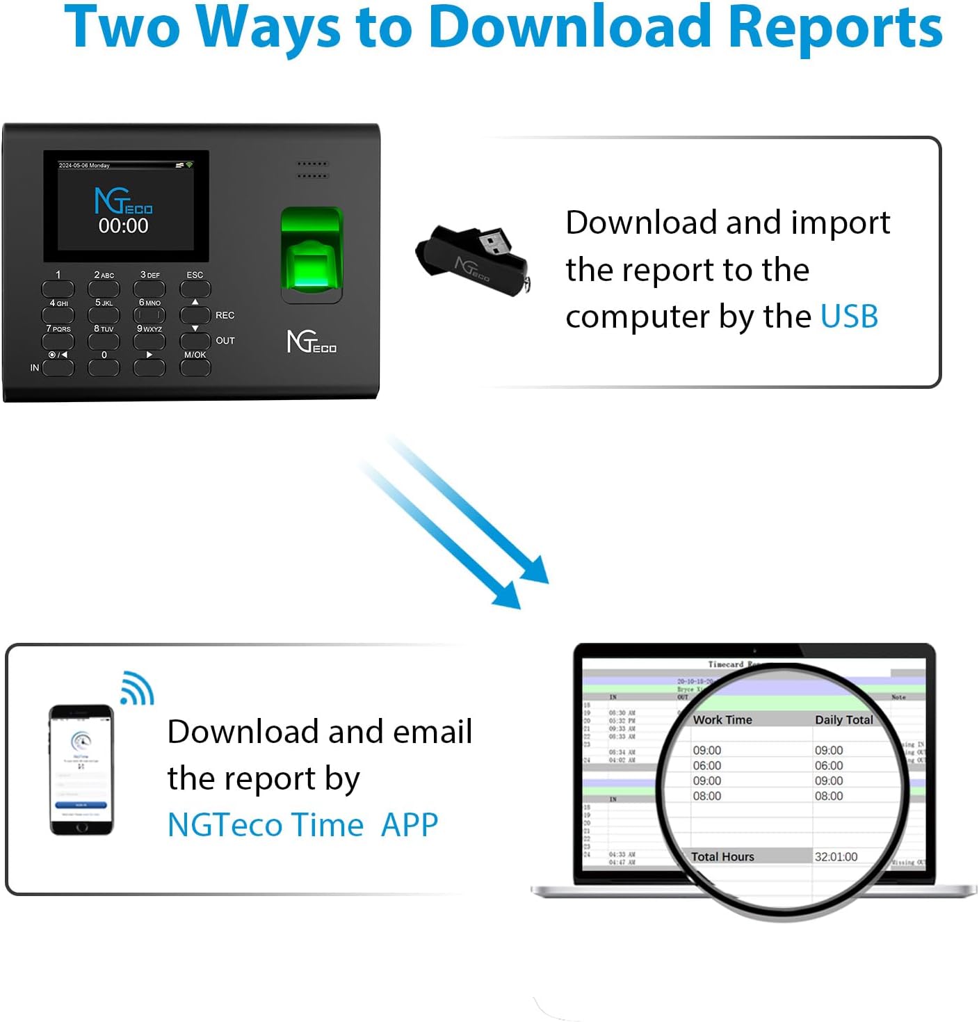Modern Upgrade from Paper Time Cards: Transition to a greener office with the K4’s paperless system, eliminating manual data entry and paper time cards. Employees can clock in and out as many times as needed each day. This upgrade saves time and money by avoiding printing errors and eliminating the need for time cards, racks, and ribbons. Easily set up pay periods, attendance rules, register users, edit missing punches, and download time reports using the NGTeco Time App (Note: Connect to the same 2.4GHz Wi-Fi network).