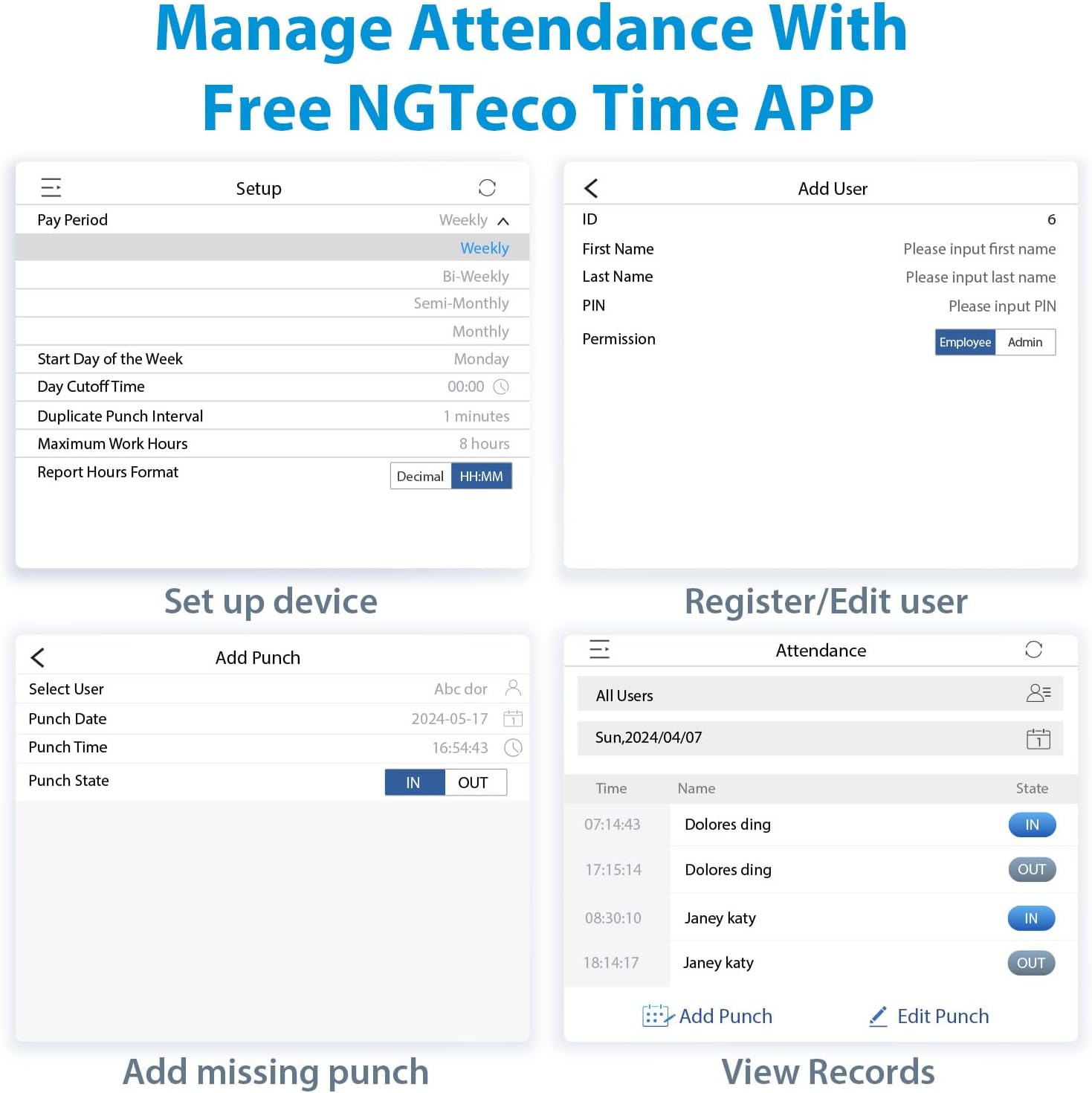 Automatic and Accurate Hour Calculations: The K4 automatically accumulates employees` hours, eliminating manual calculations. Export attendance reports with a single click via USB or the app. The built-in software supports shift and data management, accommodating weekly, bi-weekly, semi-monthly, or monthly pay periods.