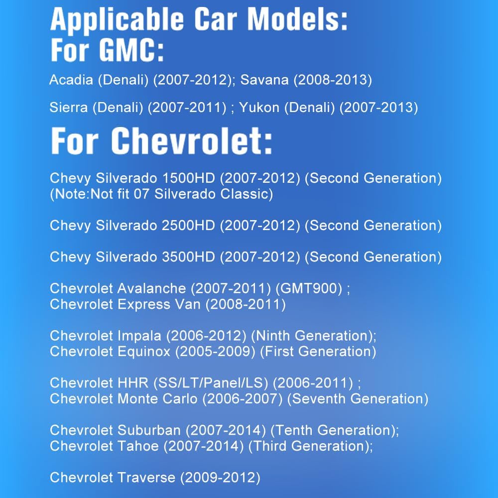 Applicable Car Models For GMC: For Acadia (Denali) (2007-2012); For Savana (2008-2013); For Sierra (Denali) (2007-2011) ;For Yukon (Denali) (2007-2013) For Chevrolet: For Chevy Silverado 1500HD(2007-2012)(Second Generation)(Note:Not fit 07 Silverado Classic) For Chevy Silverado 2500HD(2007-2012)(Second Generation) For Chevy Silverado 3500HD(2007-2012)(Second Generation)