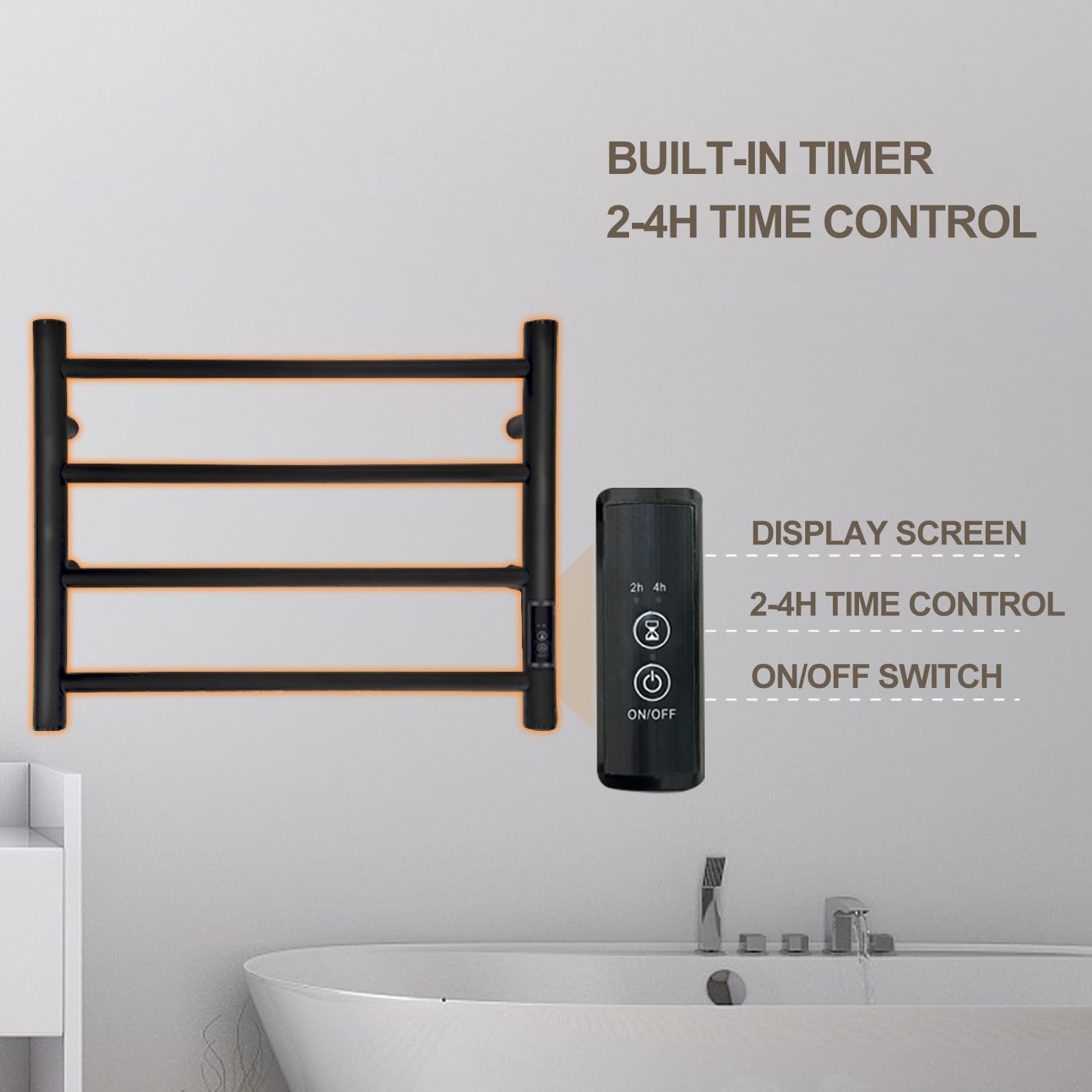 Convenience and Safety It is easy to operate; The towel dryer for bathrooms has touch buttons embedded; and with 2 working time settings: press the control button, setting 2 or 4 hours running time, after the setting time running out, it shut-off automaticly, The working temperature is 131(Fahrenheit). And the towel warmer rack is designed with IPX4 Water Proof Grade.