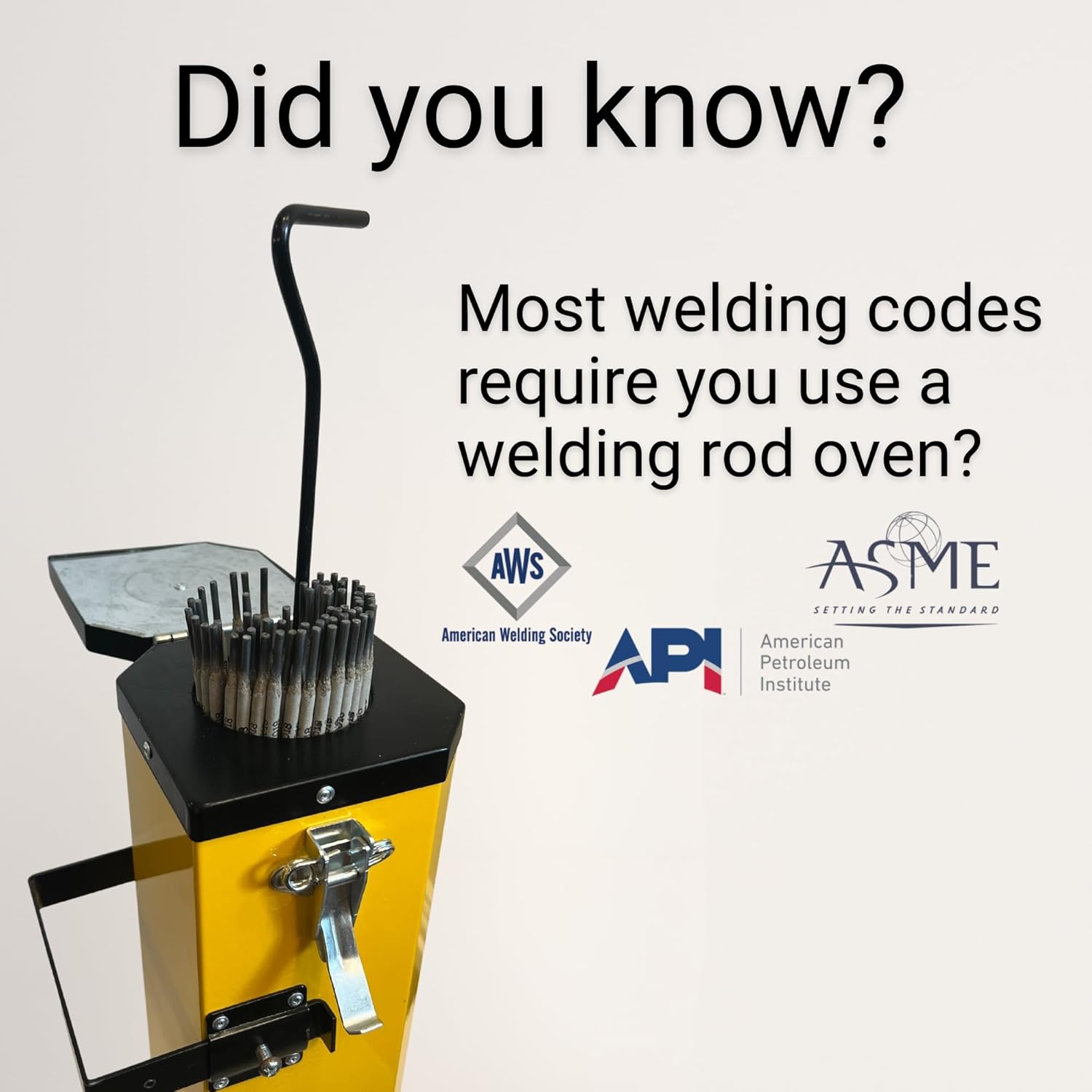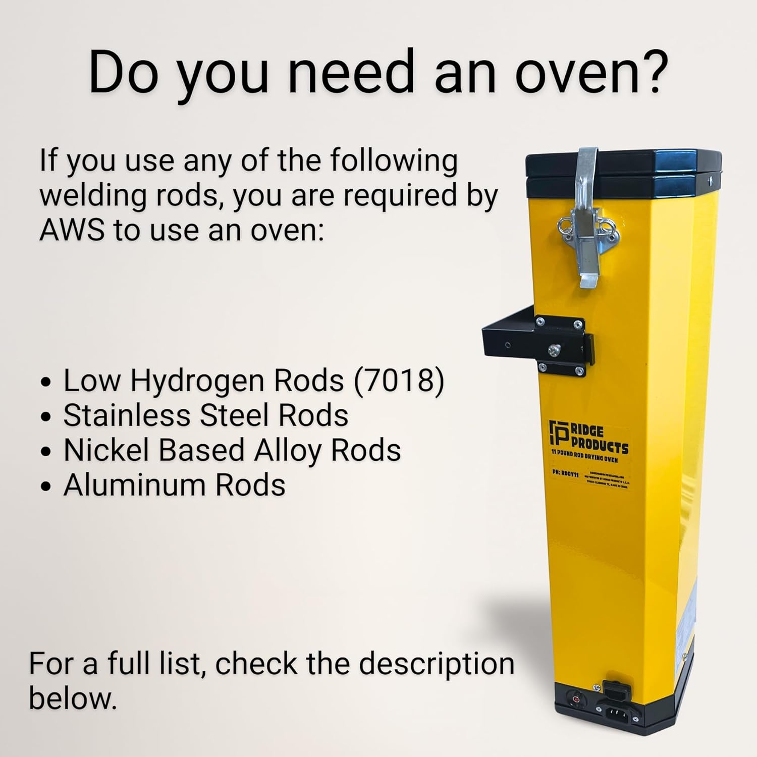 Many types of welding rods require use of an oven to follow quality laws and regulations. Check chart below to verify if you need an oven for the electrode type you use