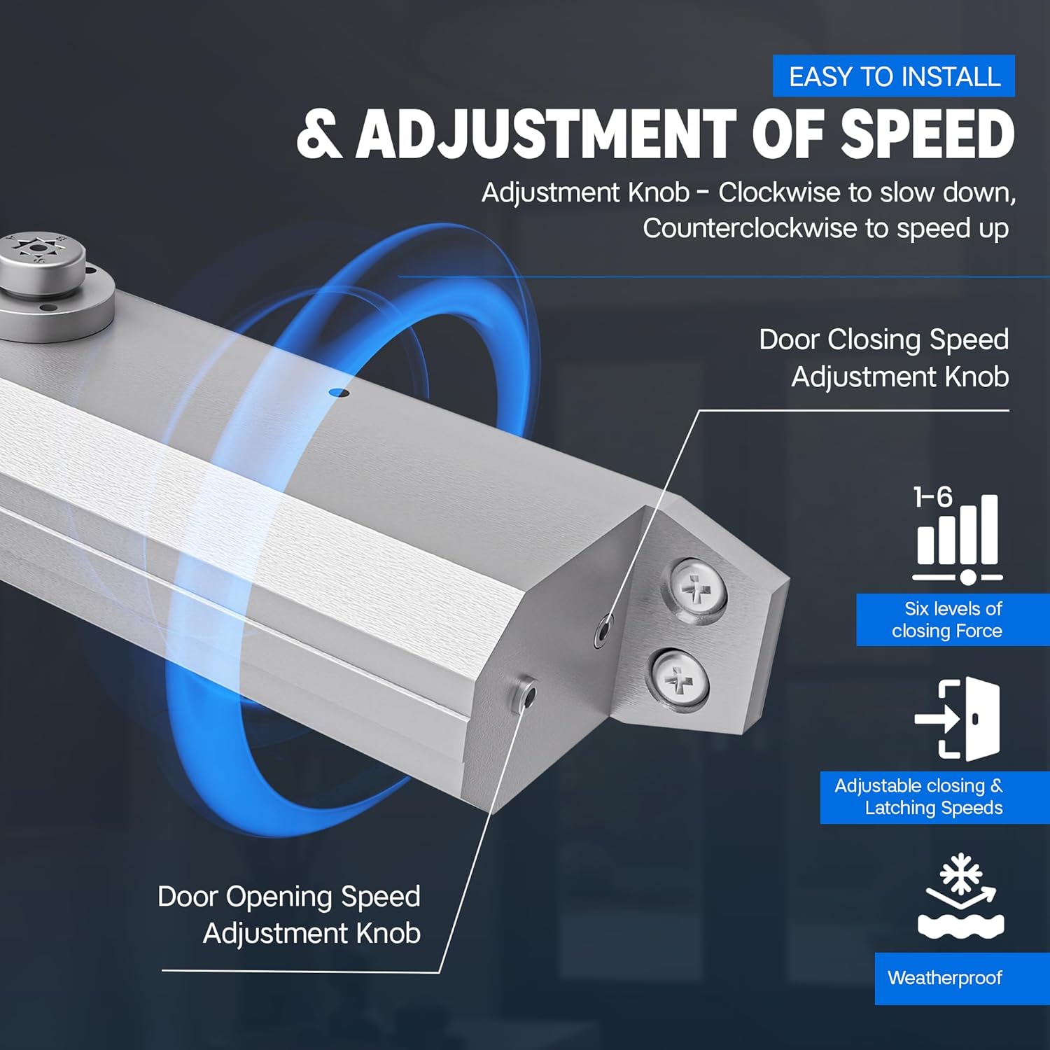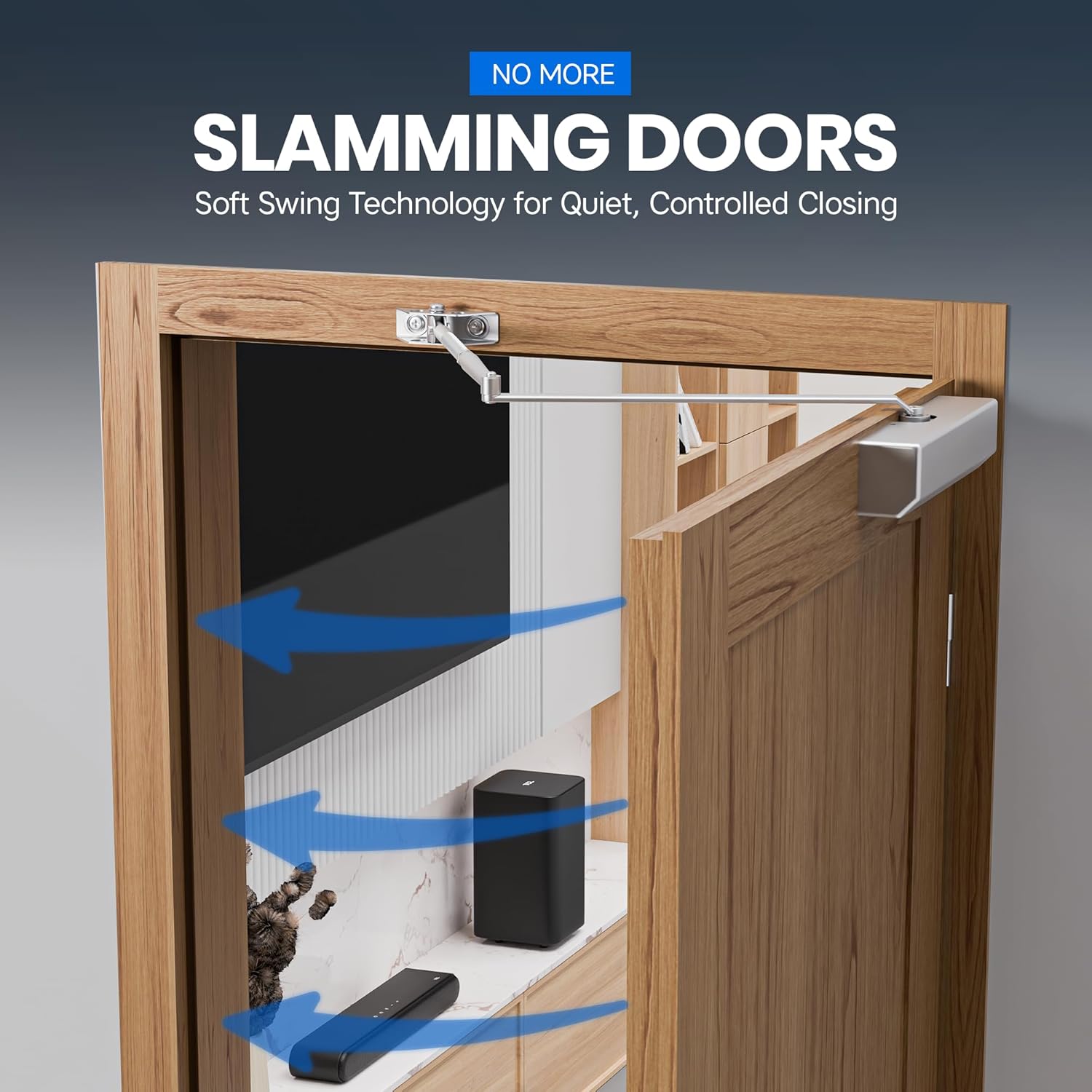 Fully Adjustable – Control Every Aspect of Closure | This adjustable door closer offers full customization with adjustable sweep, latch speed, and backcheck functions. Whether you need a slow door closer for gentle operation or a soft door closer for noiseless performance, this model can be tailored to your preference. With this multifunctional door closer, you can prevent slamming, improve safety, and achieve the perfect door closing speed.